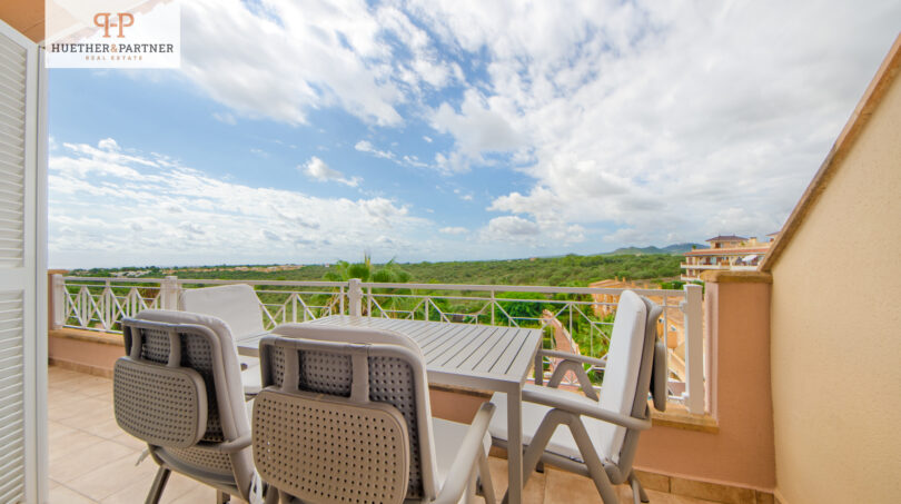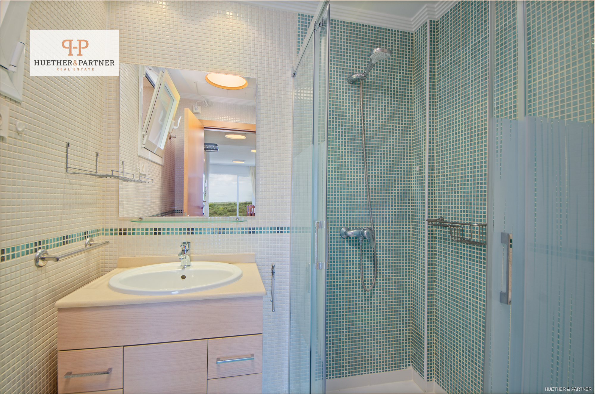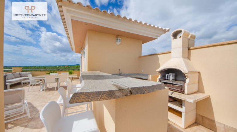 Cales de Mallorca / Mallorcas OstenDieses Penthouse zum Verkauf ist luxuriös eingerichtet und erfüllt die Ansprüche gehobener Wohnkultur. Es bietet einen beeindruckenden Panoramablick auf den Poolbereich, das Meer und die umliegenden Berge, der von großen, bodentiefen Fenstern und einer offenen Gestaltung optimal eingefangen wird. Die großzügige Dachterrasse mit Grill- und Outdoor-Küche lädt zum entspannten Verweilen ein und bietet zugleich ausreichend Platz für gesellige Abende im Freien. Nach einem Sonnenbad sorgt eine erfrischende Außendusche für zusätzlichen Komfort.