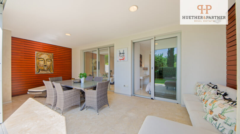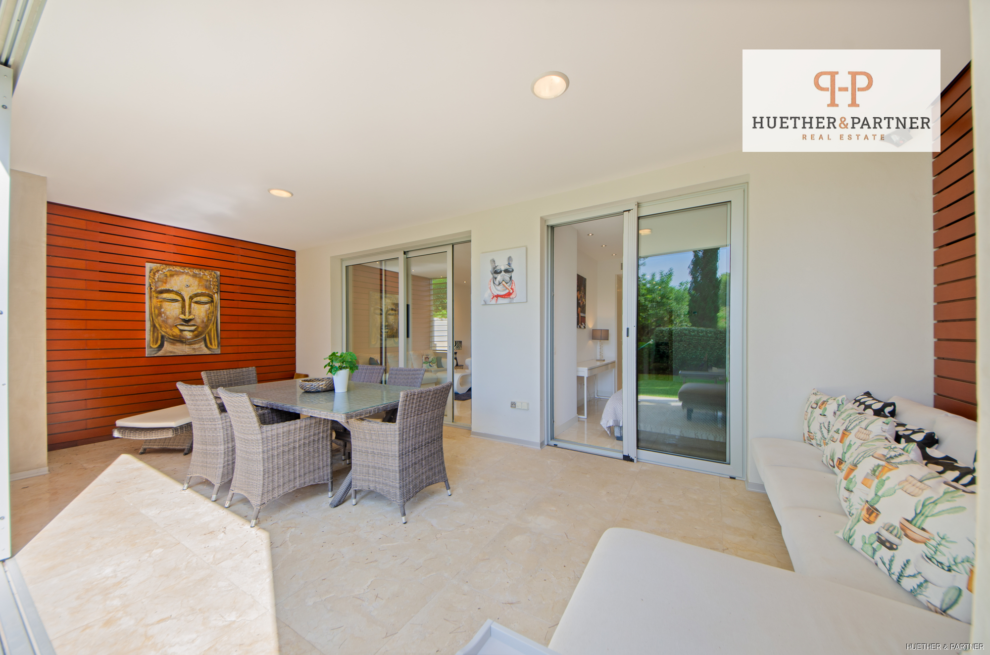 Die Immobilie verfügt über eine Gesamtfläche von ca. 182m², davon etwa 119m² Wohnfläche, sowie einen privaten Garten von ca. 19m², der exklusiv zur Wohnung gehört und direkten Zugang zur gepflegten Gemeinschaftsanlage mit Pool bietet. Der lichtdurchflutete Wohn- und Essbereich öffnet sich zu einer sonnigen Terrasse mit Blick ins Grüne. Die offene Küche ist mit hochwertigen Siemens-Geräten, Waschmaschine und Trockner ausgestattet. Zwei Schlafzimmer, jeweils mit eigenem Bad, schaffen ein harmonisches Wohngefühl mit viel Komfort und Privatsphäre. Eine zweite Terrasse von ca. 20m² erweitert den Wohnraum ins Freie.