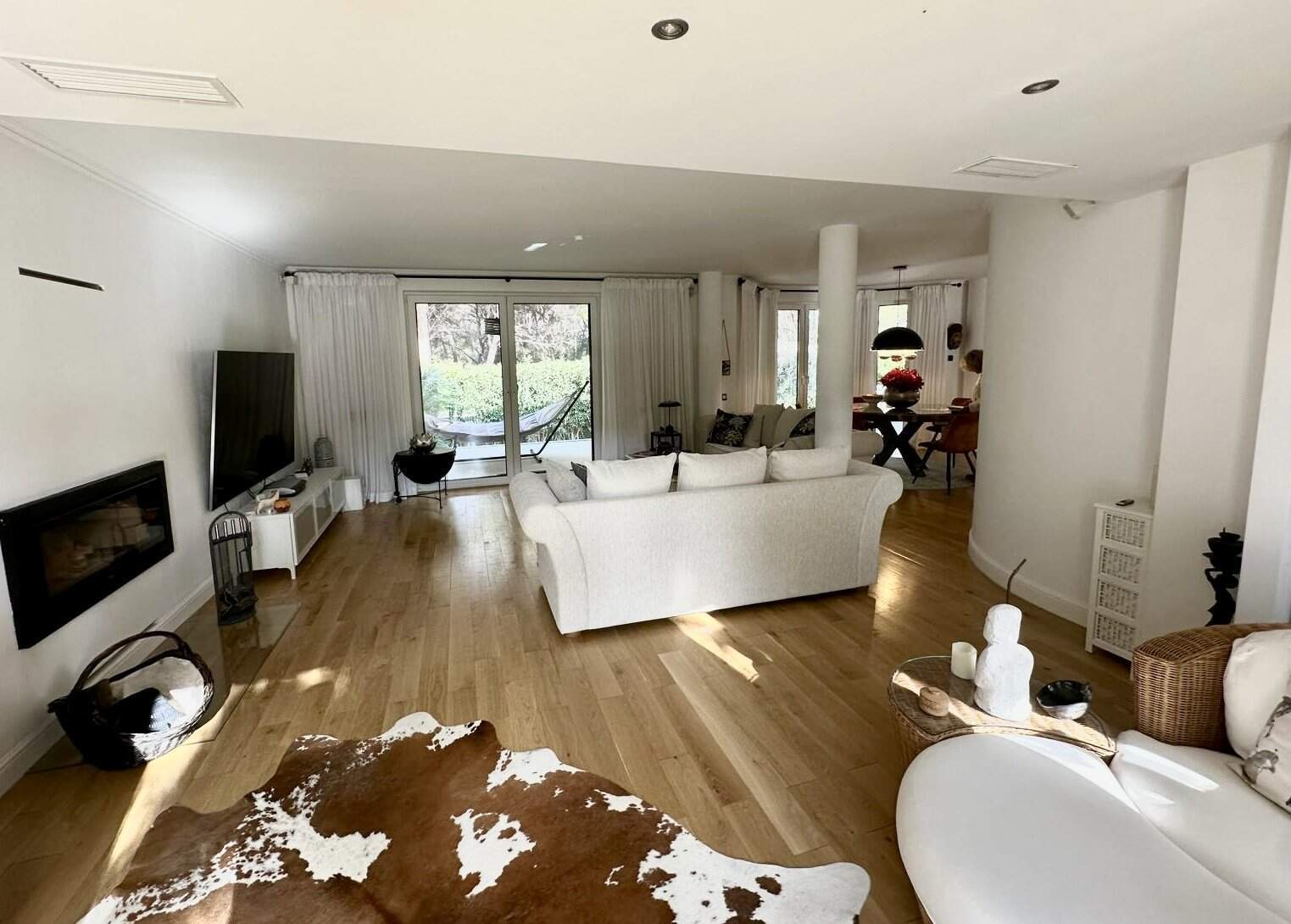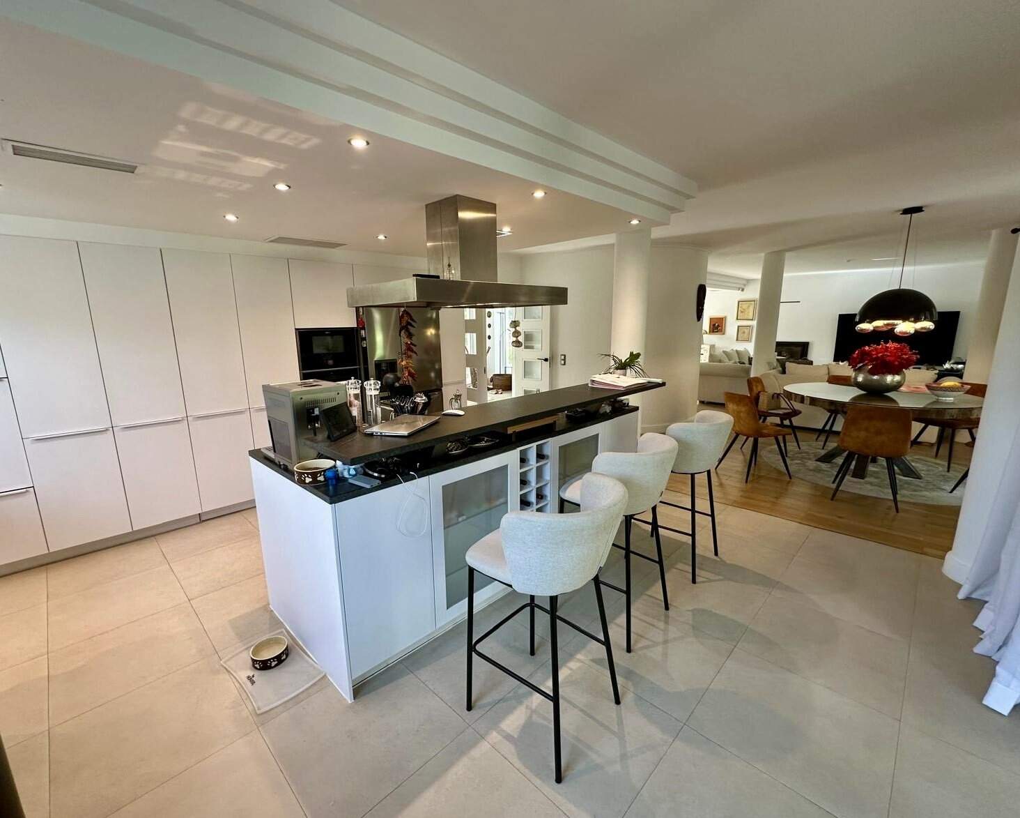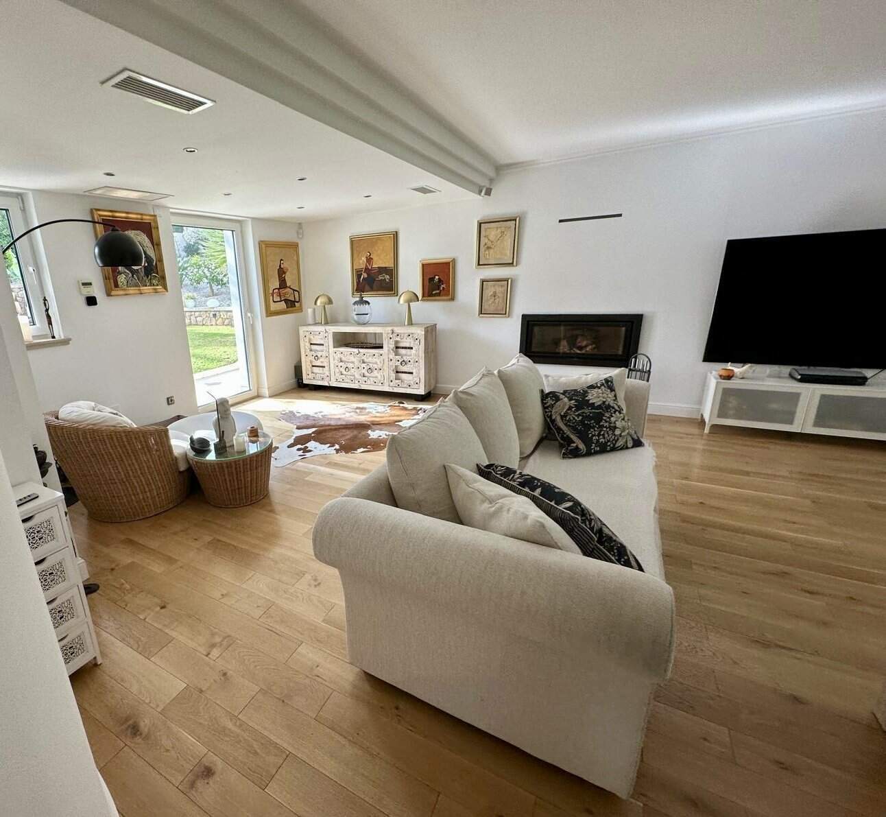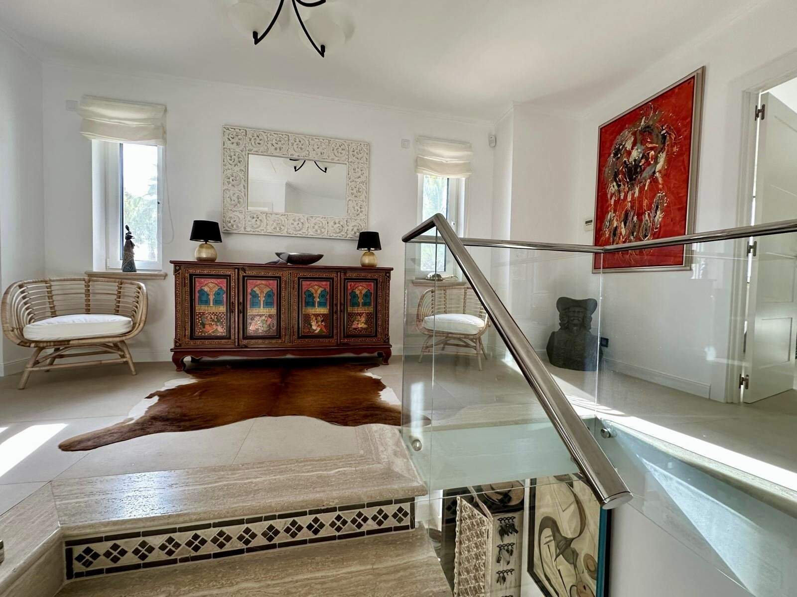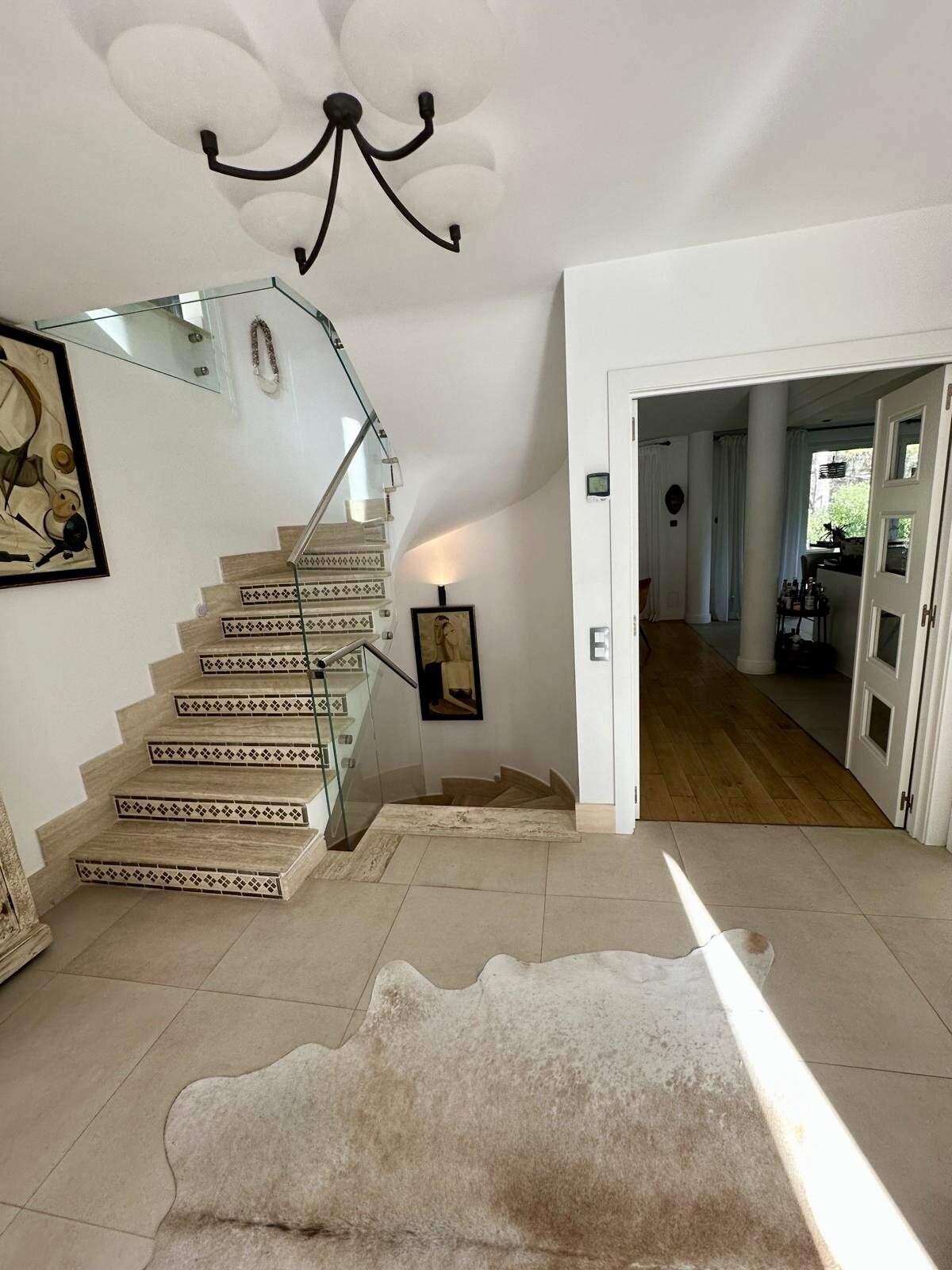 Die Villa erstreckt sich über drei Ebenen: Der Hauptwohnbereich auf zwei Etagen bietet helle, großzügige Wohnräume, eine moderne Design-Küche mit hochwertigen Geräten, Kamin, Büro und fünf luxuriöse Schlafzimmer.