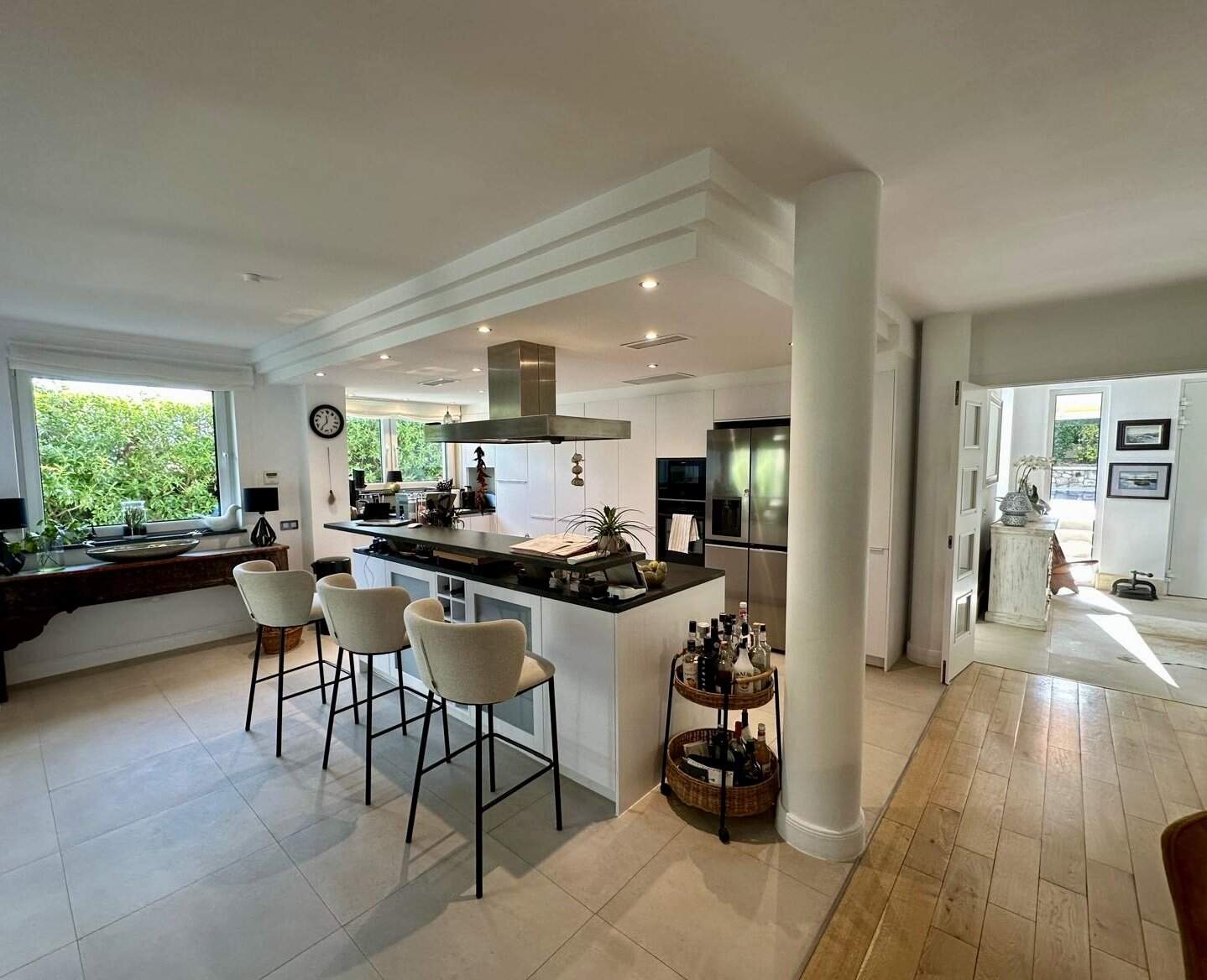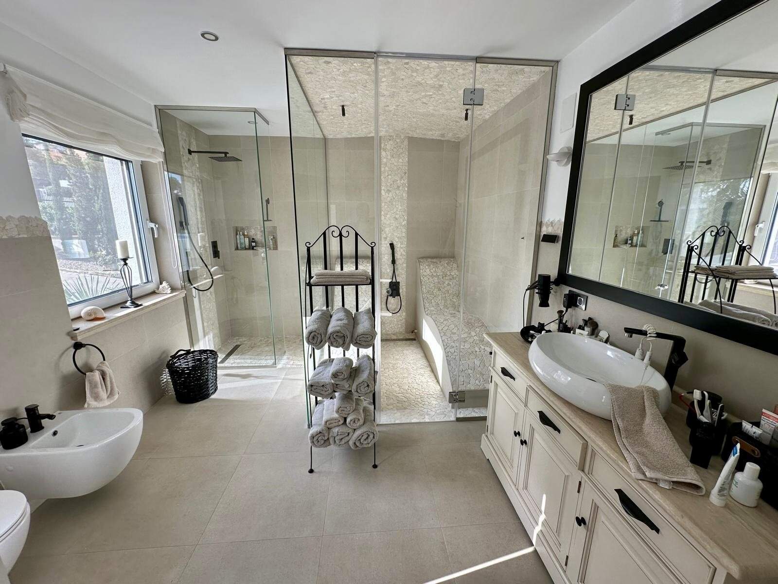 Der Außenbereich ist ein mediterranes Paradies: Salzwasserpool, Sonnenterrassen, tropischer Garten, Obstbäume, dekorativer Fischteich und direkter Zugang zum Wald. Highlight ist die großzügige Designer-Außenküche am Pool mit Gas- und Holzkohlegrill, Pizzaofen, Cerankochfeld, Kühlschrank, Spüle und Pergola – ideal für gesellige Sommerabende.