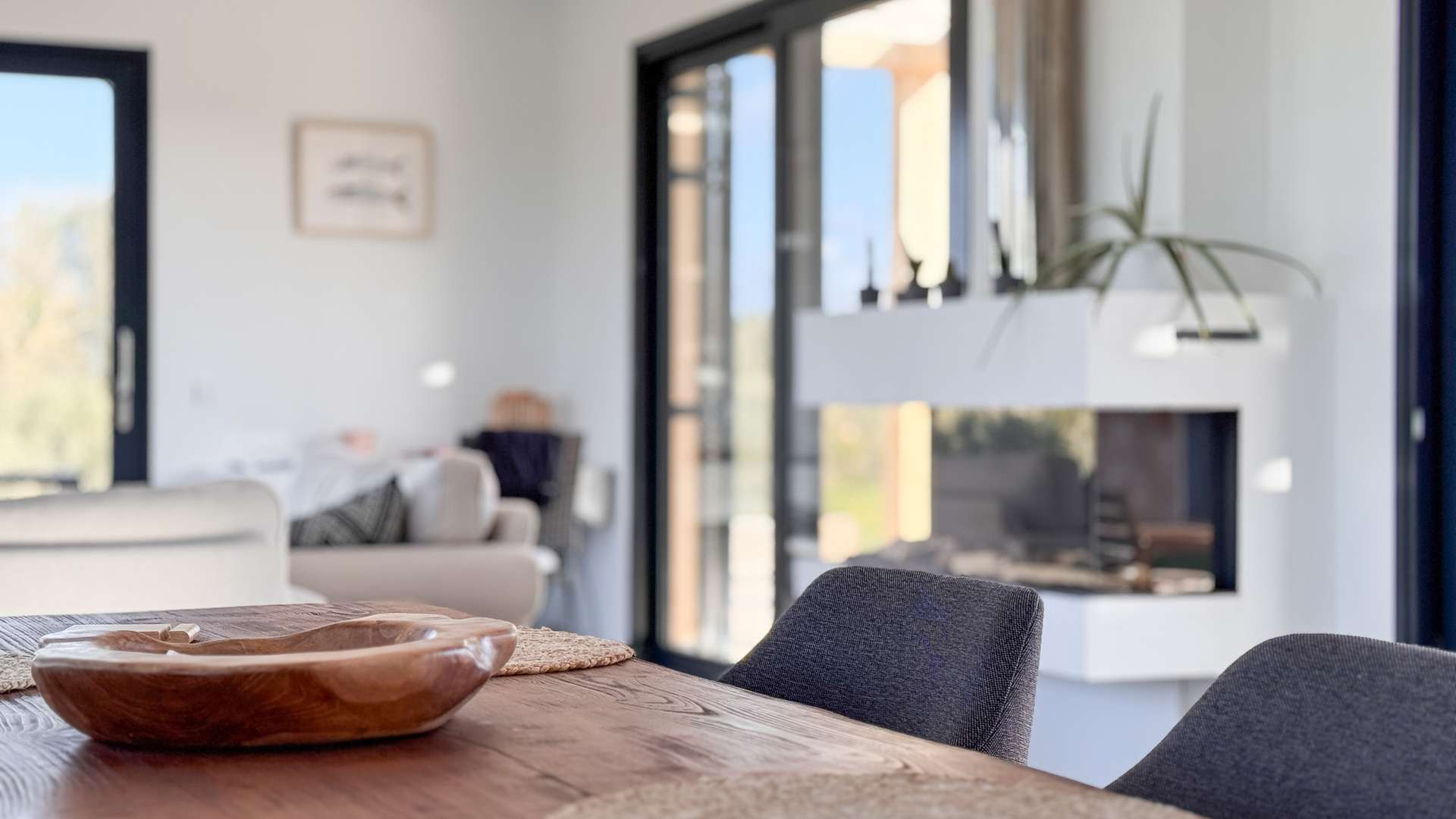 - Großzügiger Wohn- und Essbereich mit stilvollem Kamin – ein Ort der Entspannung mit fantastischem Ausblick.
