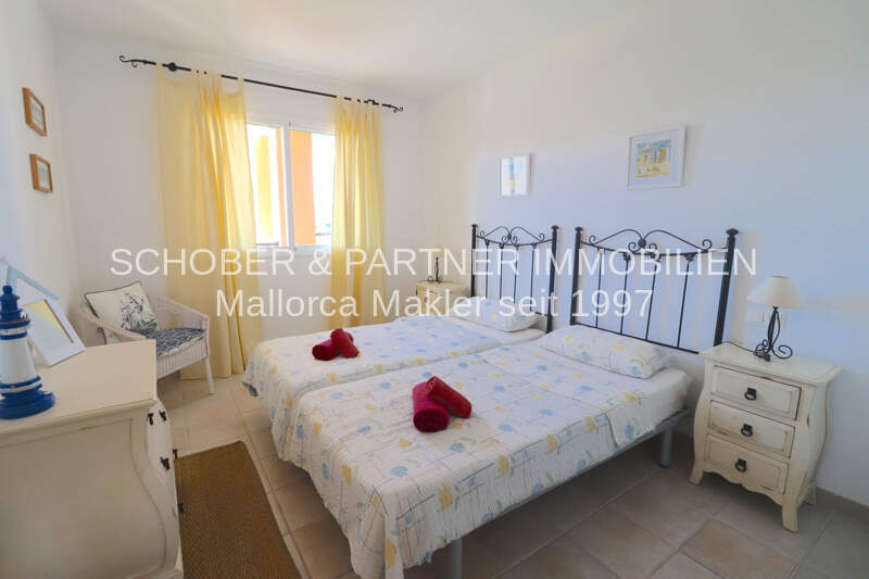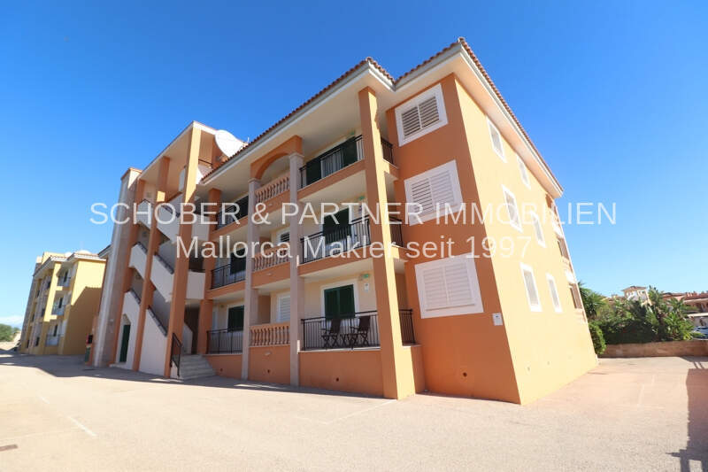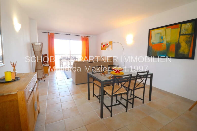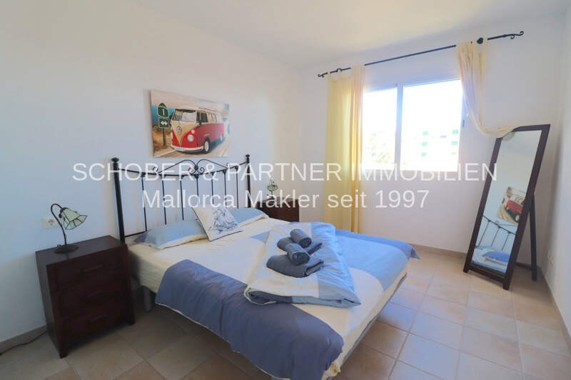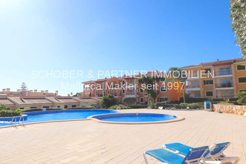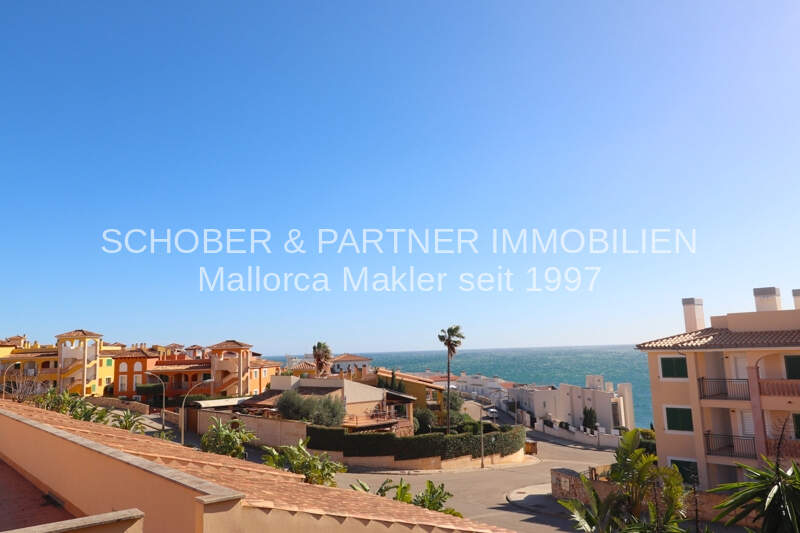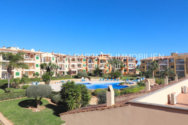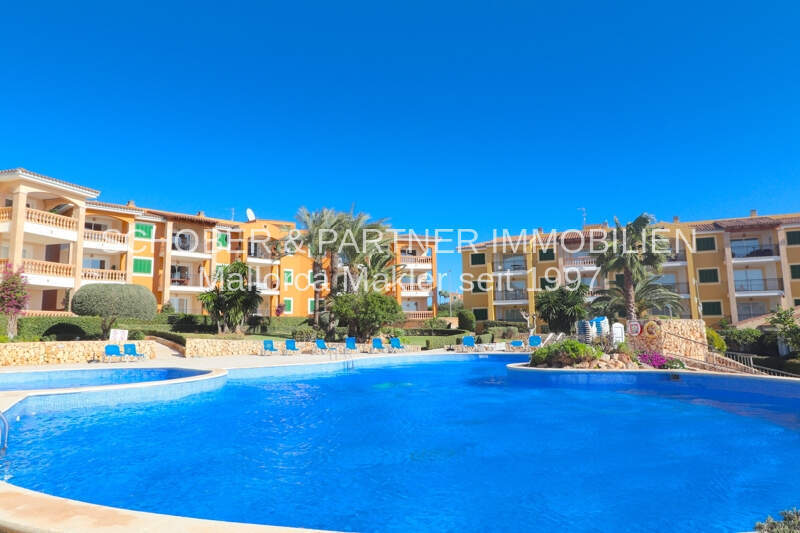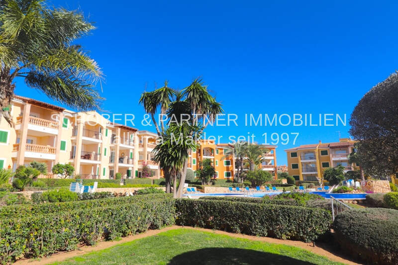 Wohnung kaufen, Cala Magrana mit Meerblick und Pool: von der Wohnung aus geht Ihr Blick rechts zum Meer und links in die mediterranen Gartenlandschaft der Gemeinschaft mit Pool. Die Gemeinschaftsanlage ist sehr gepflegt und großzügig. Die verschiedene Mehrfamilienhäuser, die im mediterranen Stil schön in die Landschaft eingebettet wurden, ziehen sich um die Pool- und Gartenanlage was einen privaten Charakter verleiht.
