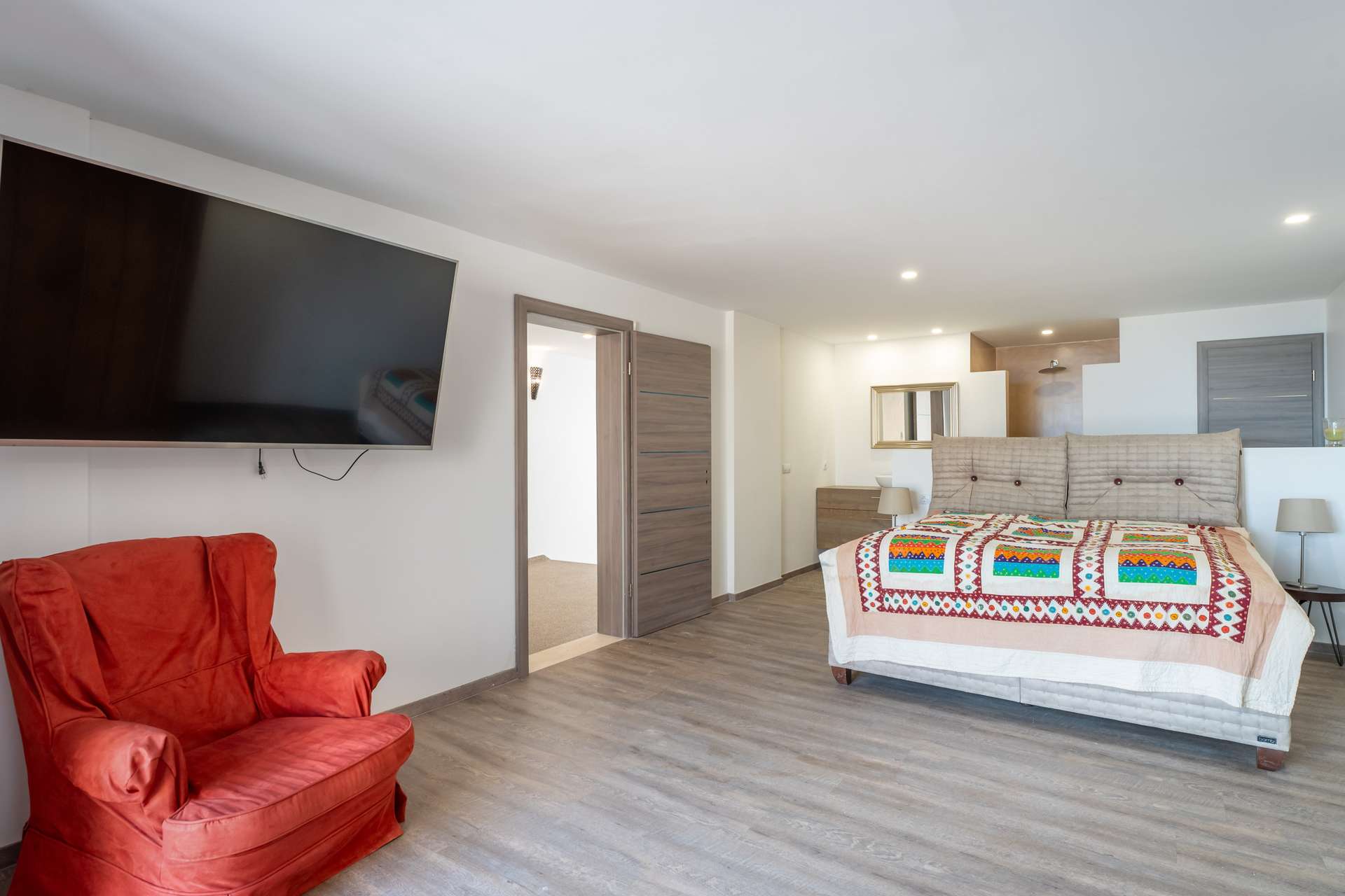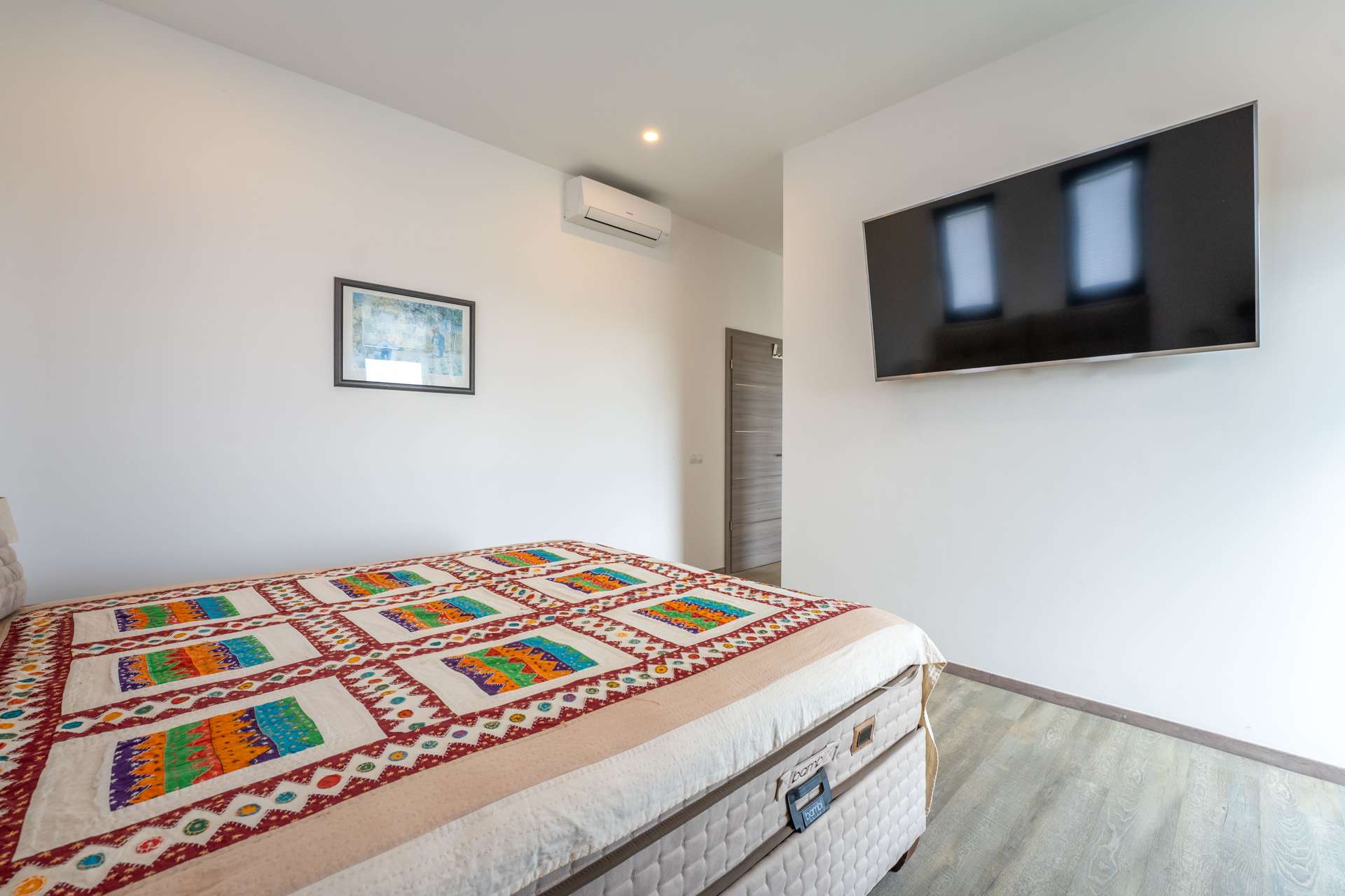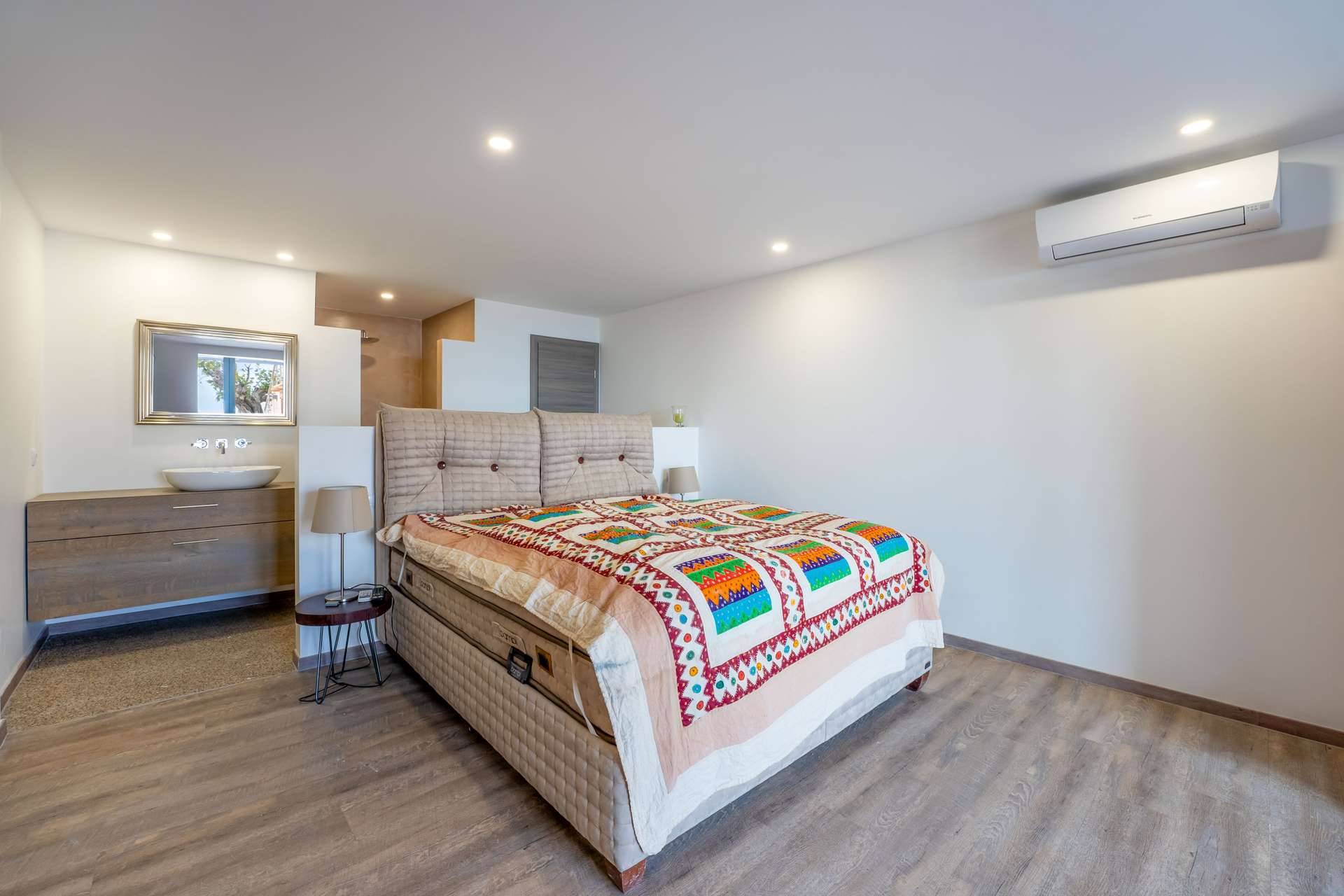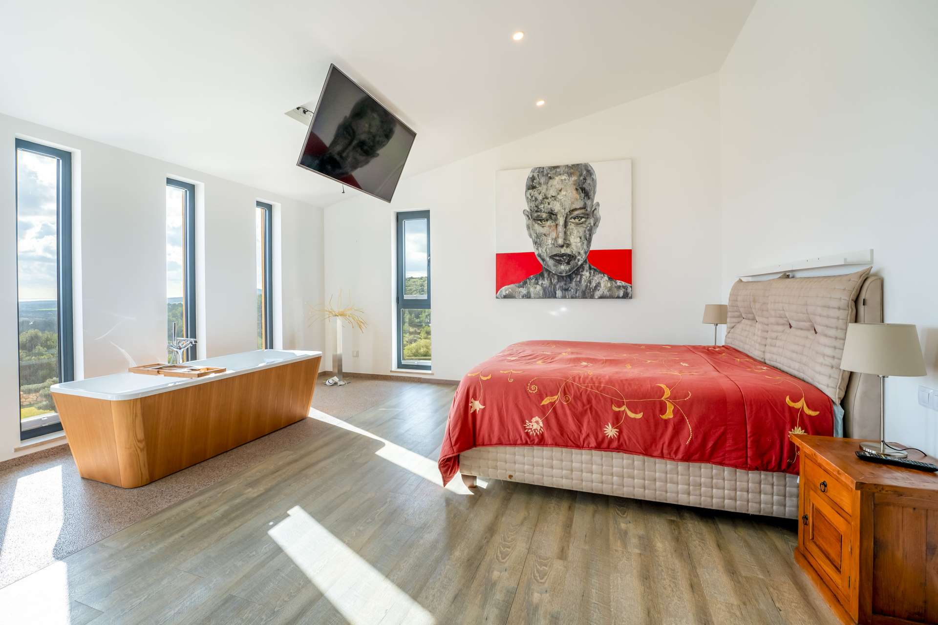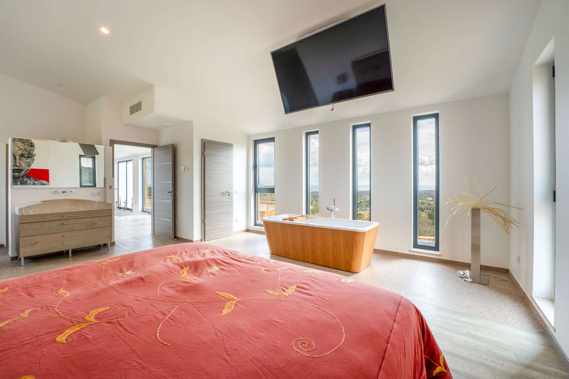 Die bebaute Fläche beträgt 354 m² und verteilt sich auf vier großzügige Schlafzimmer, jeweils mit Bad en suite. Der lichtdurchflutete Wohnbereich überzeugt durch Panoramafenster sowie eine offene Designküche mit Markengeräten von Neff und Smeg inklusive Kochinsel. Alle Schlafzimmer bieten ein hohes Maß an Privatsphäre sowie direkten Zugang zu den Außenbereichen. Das Master-Schlafzimmer verfügt über ein Ankleidezimmer und eine großzügige Terrasse.