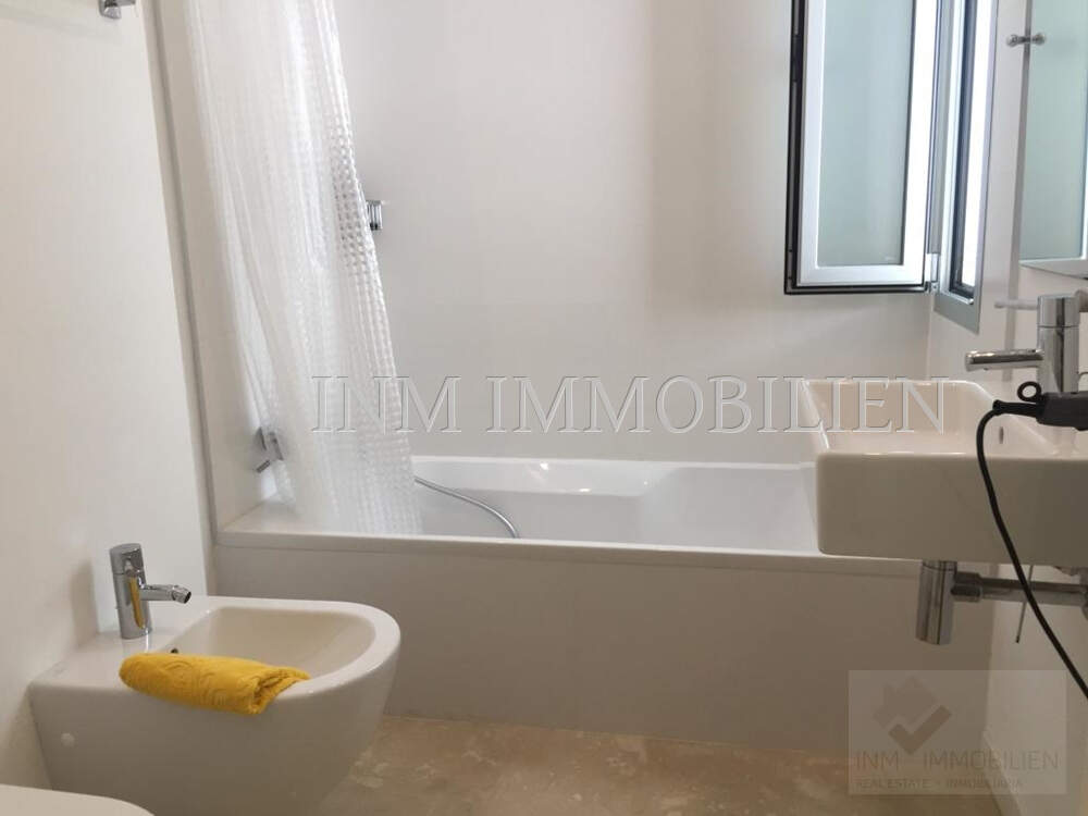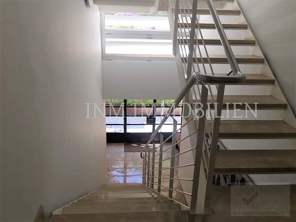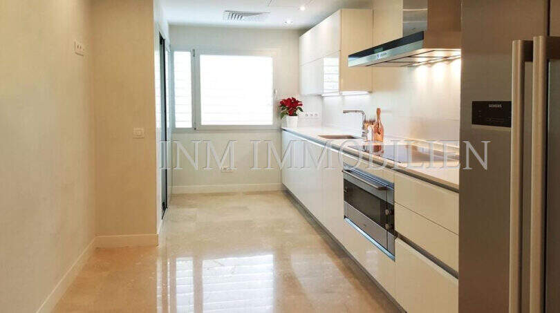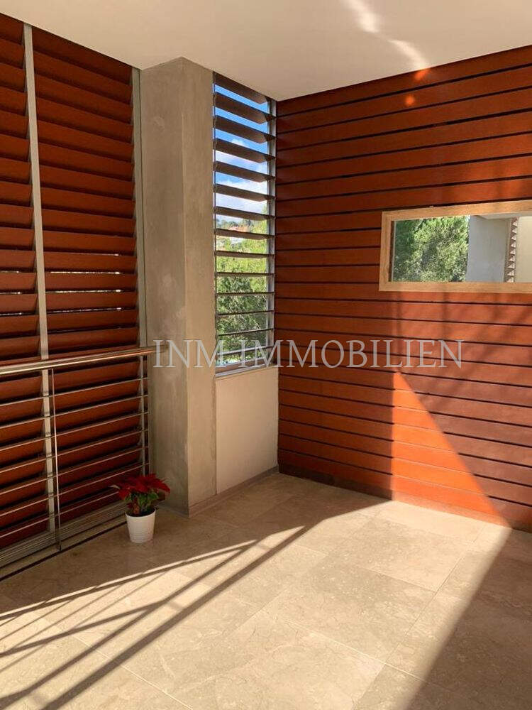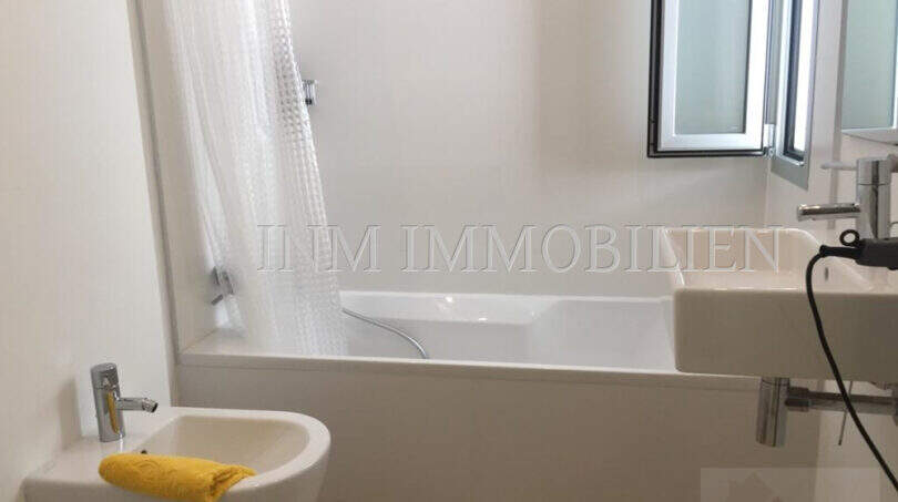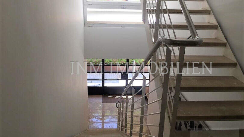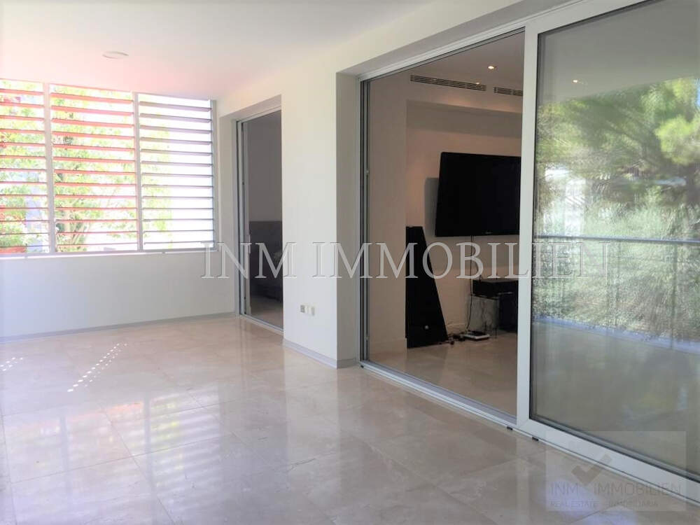 Sie verfügt über einen Wohnbereich mit Zugang zur Terrasse, eine Einbauküche, drei Schlafzimmer, zwei Badezimmer und ein Gäste-WC. Zur Mietwohnung gehören ein Tiefgaragenstellplatz und ein Abstellraum. Die Fläche teilt sich auf in 186m² Wohnfläche, 28m² überdachte Terrasse und eine 30m² unüberdachte Dachterrasse mit Blick auf den Garten und Pool.