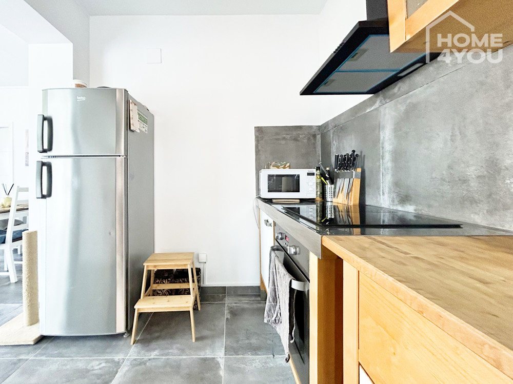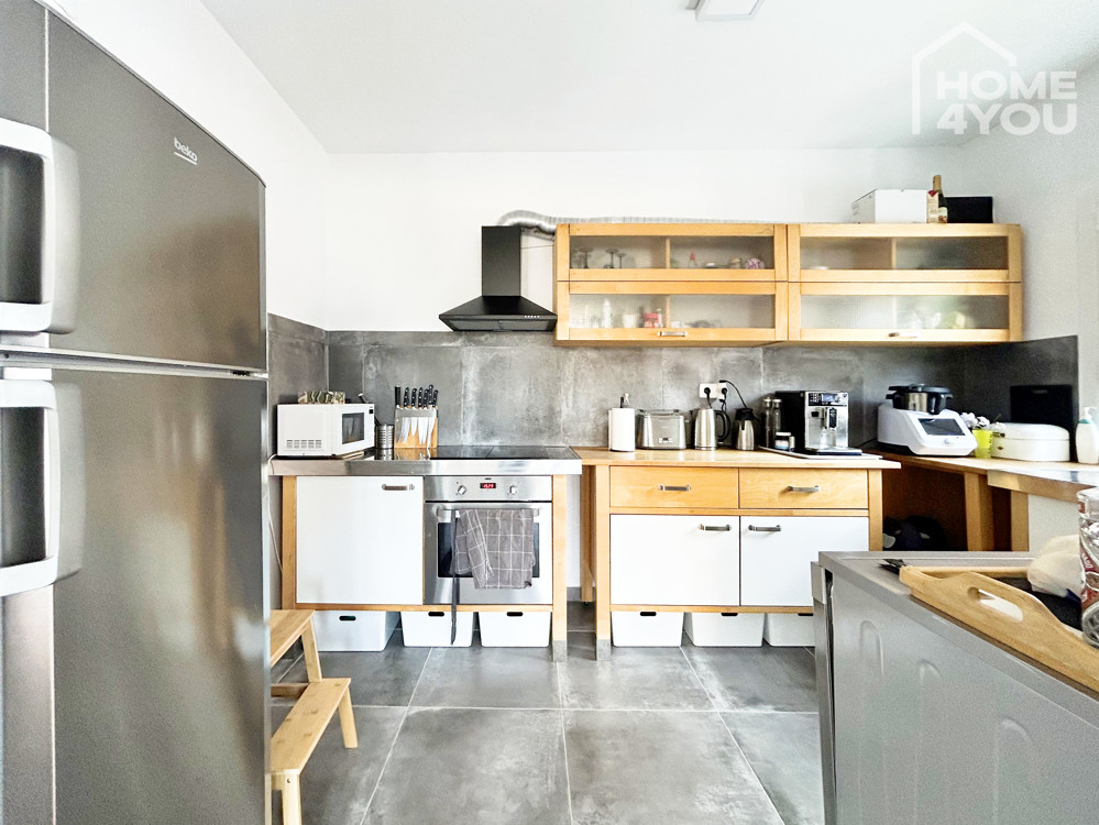 Im Erdgeschoss befindet sich eine rund 65m² große Wohnung mit zwei Schlafzimmern, einem modernen Badezimmer sowie einem offenen Wohn- und Essbereich mit Kamin. Der direkte Zugang zu einer großen Terrasse und dem ca. 200m² Garten schafft eine angenehme Wohnatmosphäre mit viel Freiraum. Zusätzlich steht ein separater Raum mit eigenem Bad und Küchenzeile zur Verfügung, perfekt als Gästezimmer, Atelier oder Homeoffice. Eine angeschlossene Garage ergänzt diese Einheit sinnvoll.