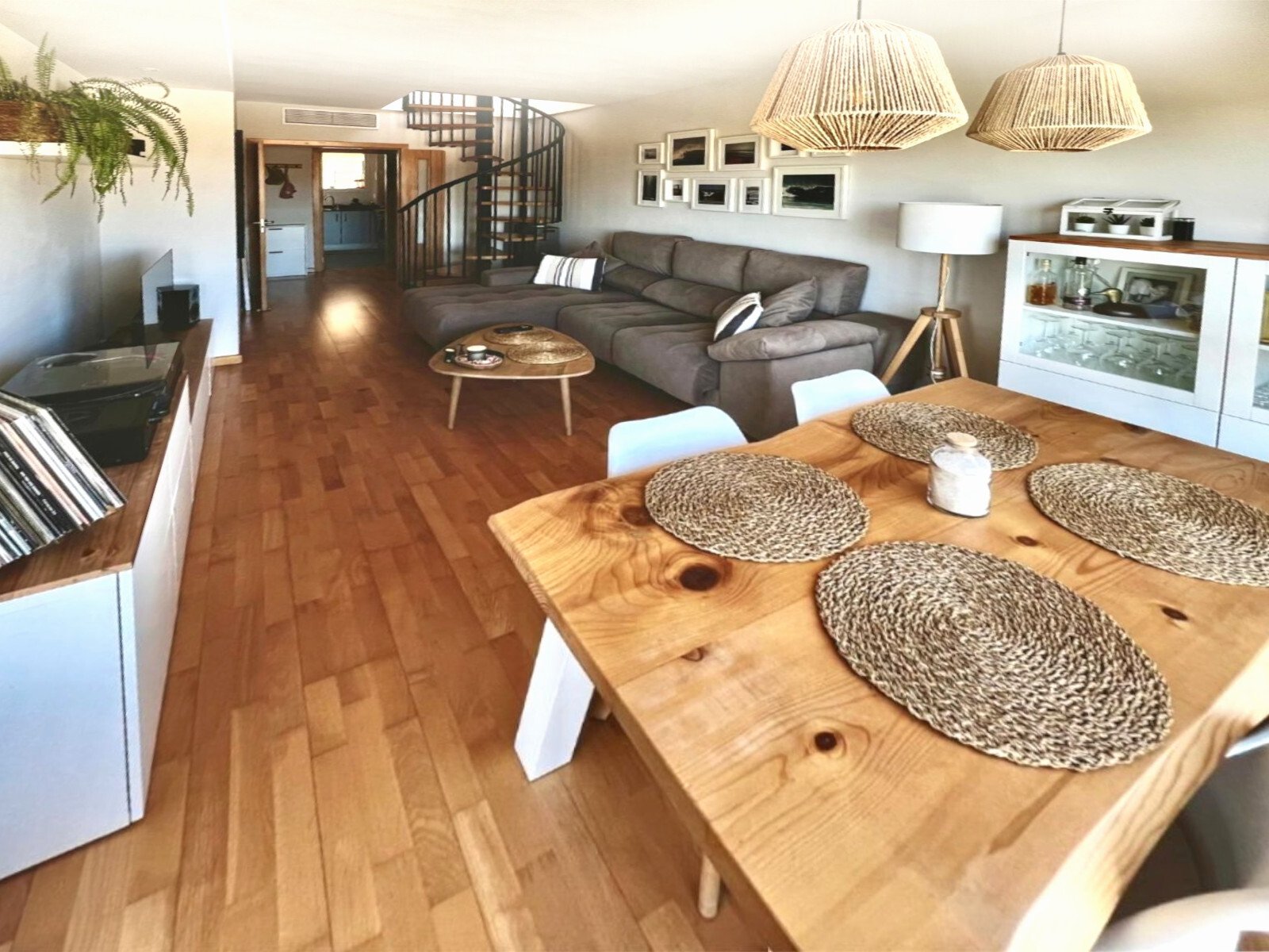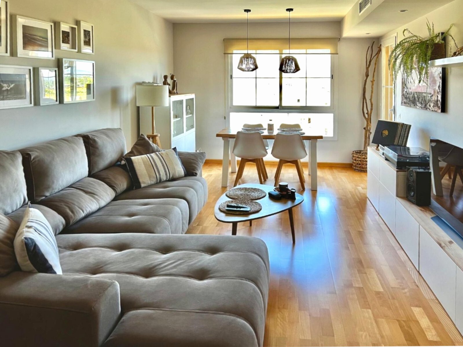 Auf einer Wohnfläche von ca. 90m² erwarten Sie zwei großzügige Doppelschlafzimmer mit maßgefertigten Einbauschränken aus edlem Buchenholz. Zwei elegante Badezimmer – eines en Suite mit Badewanne, das andere mit moderner Dusche – runden den privaten Rückzugsbereich ab. Die offene Küche überzeugt mit einem eleganten Design und ist mit hochwertigen, voll integrierten Markengeräten ausgestattet. Ein separater Hauswirtschaftsraum mit Spülbecken und Gastherme sorgt für zusätzlichen Komfort im Alltag. Der helle Wohn- und Essbereich bietet direkten Zugang zu einem Balkon, der einen freien Blick auf das majestätische Tramuntana-Gebirge eröffnet. Über eine stilvolle Wendeltreppe gelangen Sie auf die exklusive, 80m² große Dachterrasse – Ihr perfekter Ort für entspannte Sonnenstunden, Dinnerpartys mit Freunden oder inspirierende Morgenroutinen mit Weitblick. Alternativ erreichen Sie die Dachterrasse bequem über das Gemeinschaftstreppenhaus.