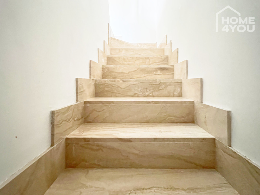 Das Erdgeschoss empfängt Sie mit einer hellen Eingangshalle unter einer eleganten Glaskuppel. Der offene Wohnbereich mit stilvollem Wohnzimmer, Esszimmer und moderner Küche mit Zugang zur Terrasse schafft ein angenehmes Raumgefühl – ideal für Alltag und Gäste. Zwei Schlafzimmer, jeweils mit Bad en suite (eins mit Ankleideraum), sowie ein zusätzliches Gäste-WC runden das Raumangebot auf dieser Ebene ab.