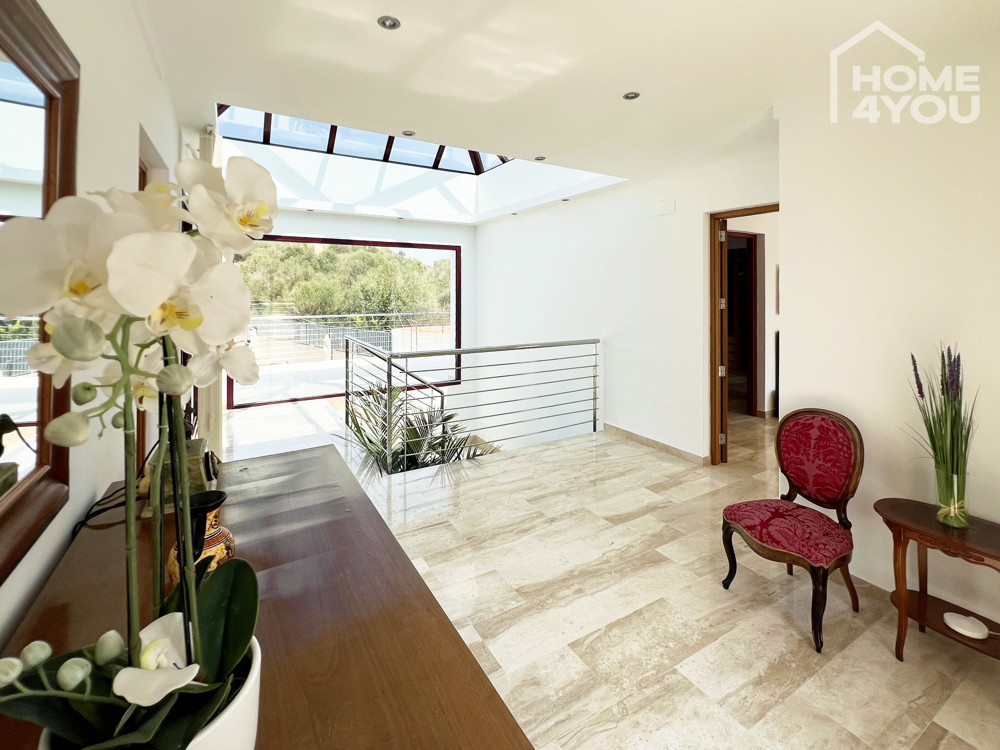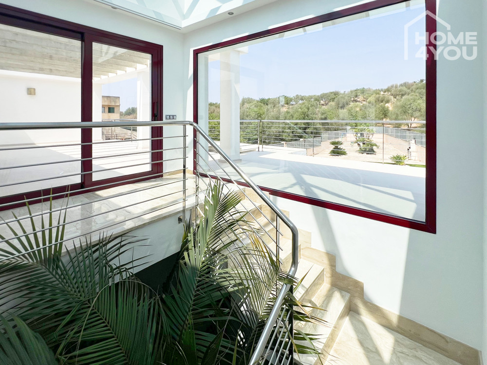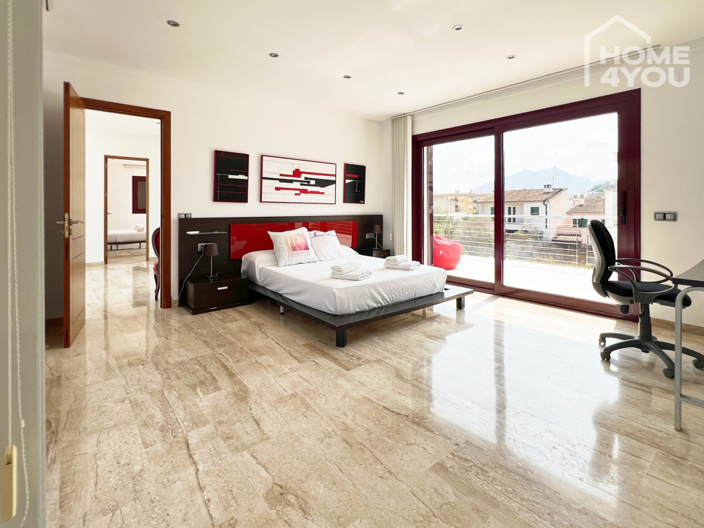 Im Obergeschoss befinden sich zwei weitere großzügige Doppelschlafzimmer mit Bad en suite, Ankleide und direktem Zugang zu weitläufigen Terrassen mit Panoramablick über Felanitx, das Umland und den San Salvador.