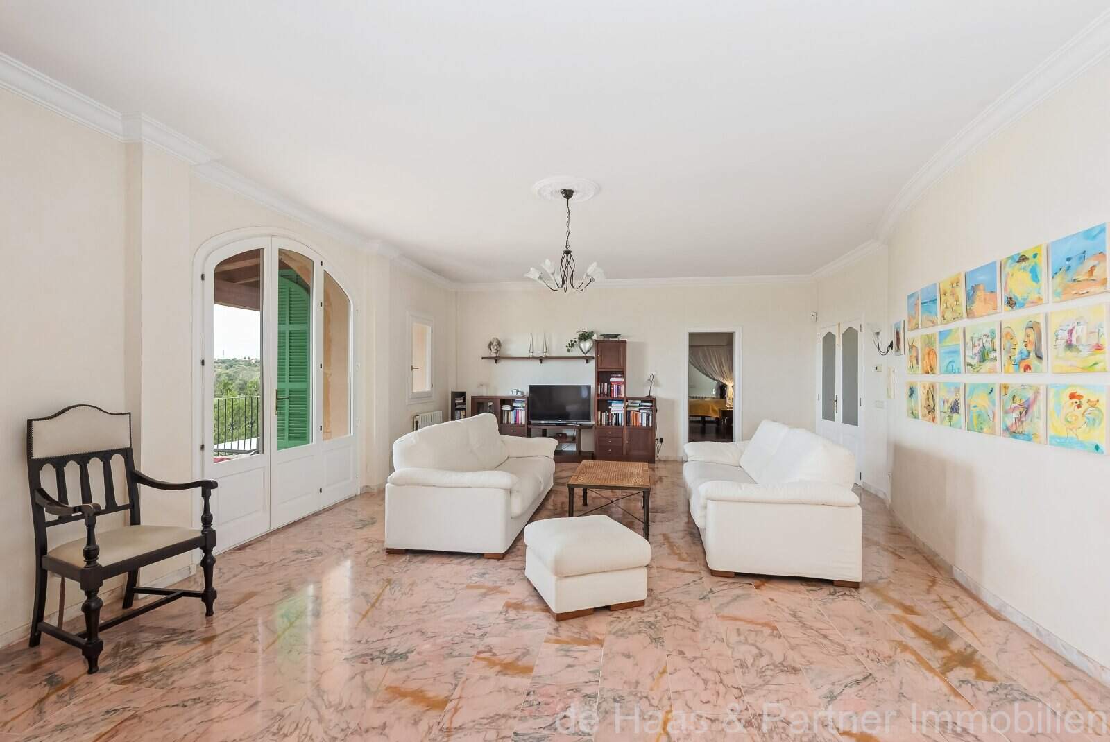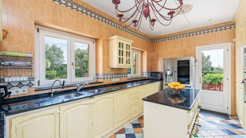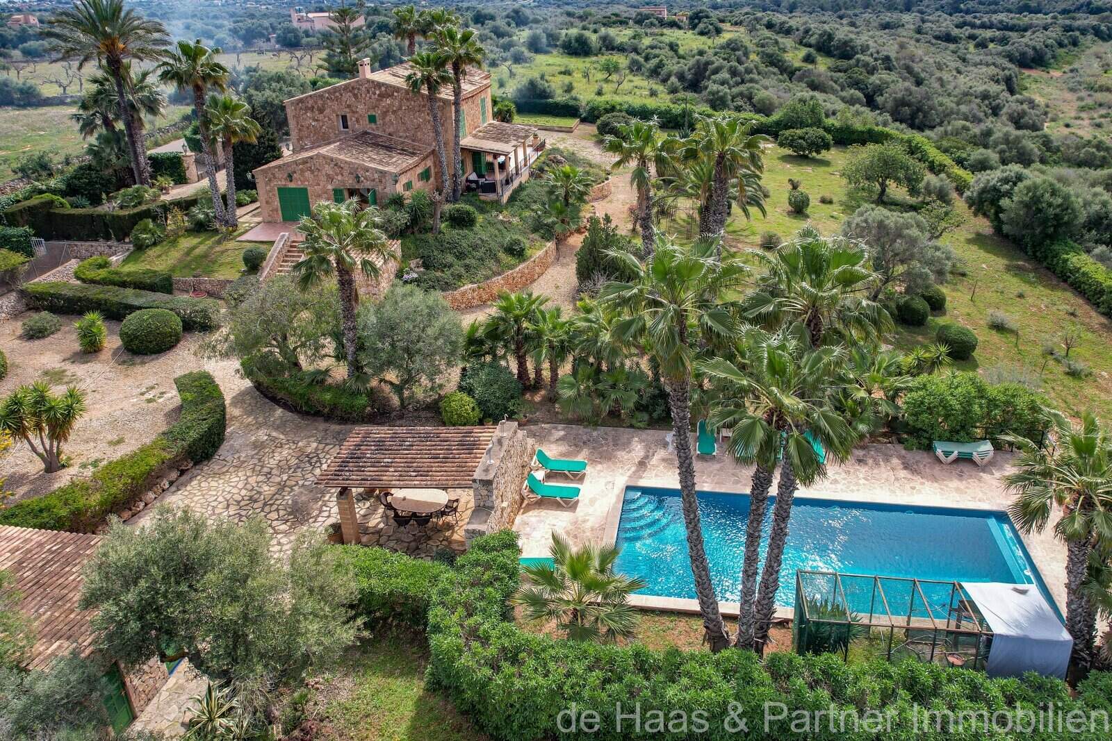 Der Außenbereich ist optimal gestaltet: zahlreiche Terrassen (teilweise überdacht), komplette Sommerküche (inkl. BBQ-Haus, Natursteinbackofen, Porche und WC), Pool (12 x 6m) mit Sonnenterrasse, liebevoll angelegter Garten (Palmen, Oliven-, Mandel- und Obstbäume u.v.m.) und Stallungen, die ideal für Pferdehaltung sind.