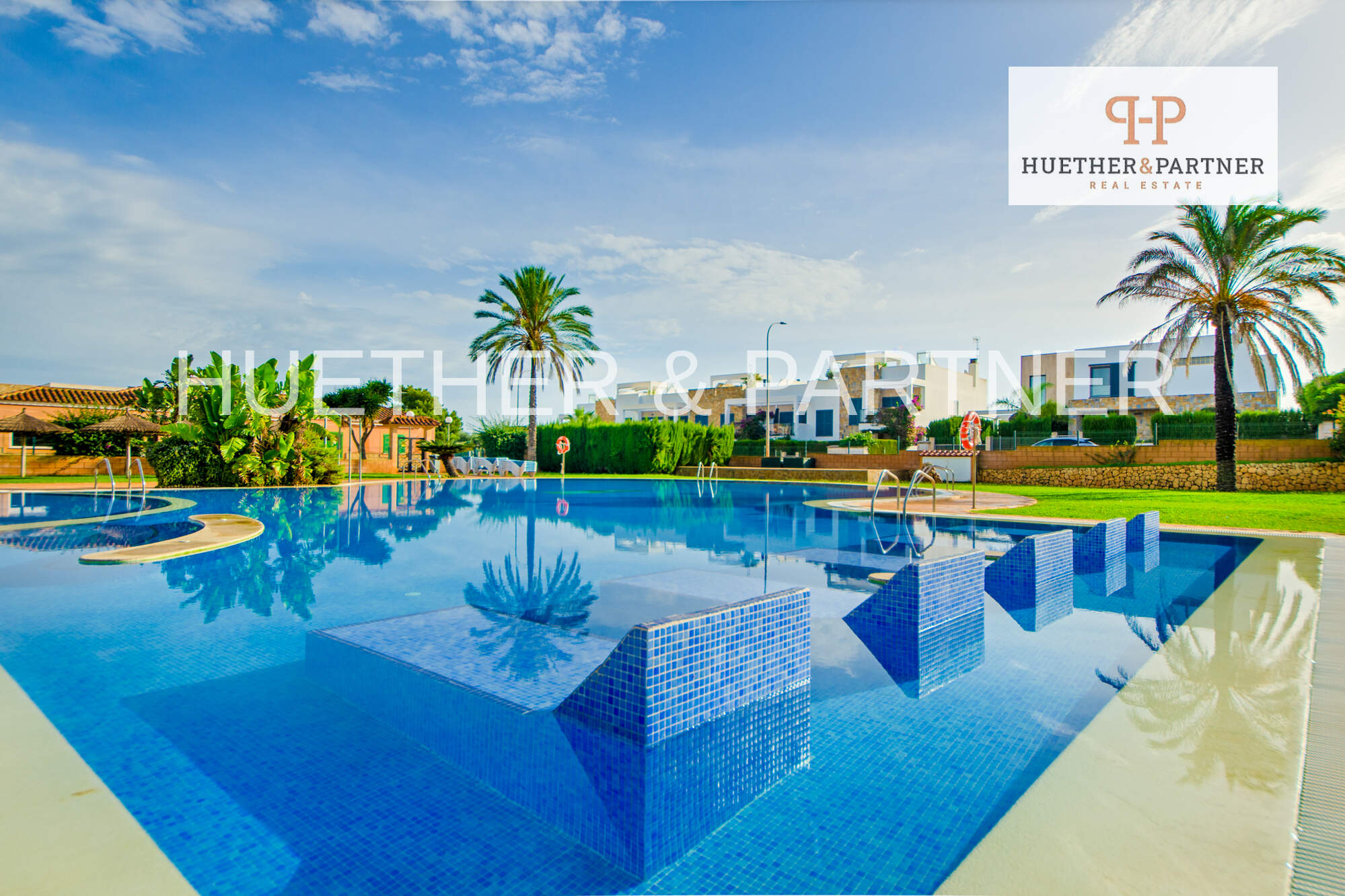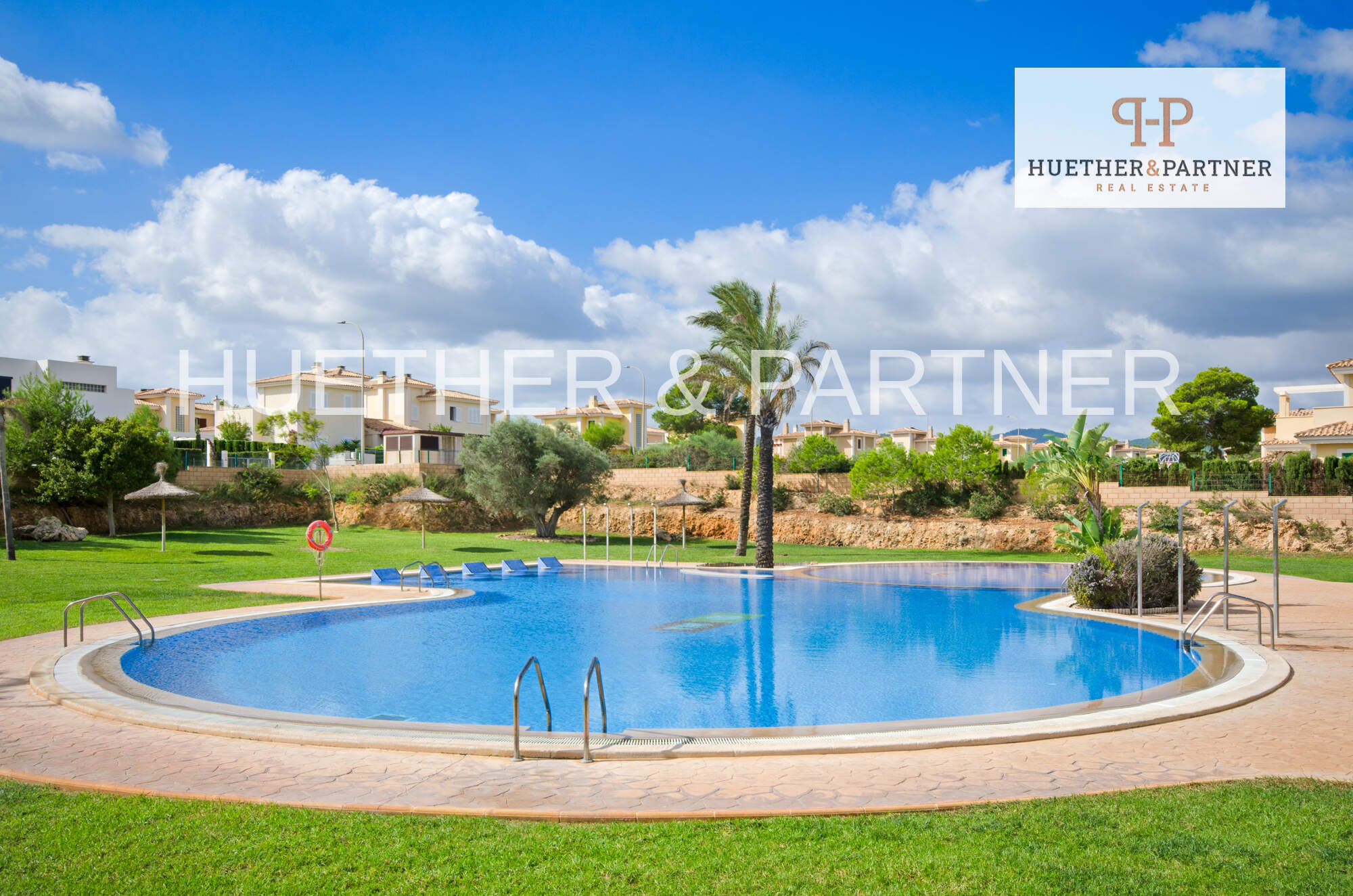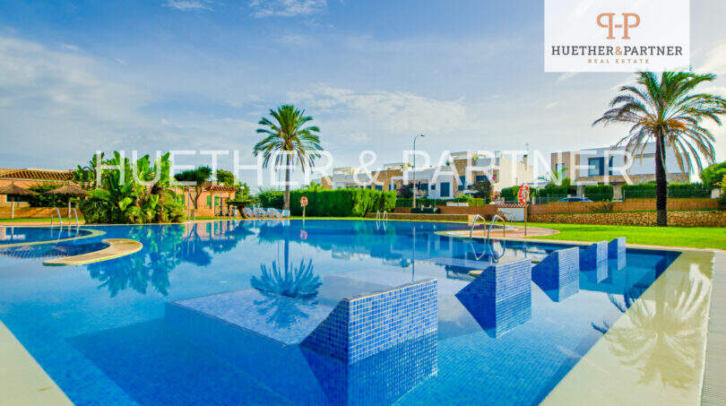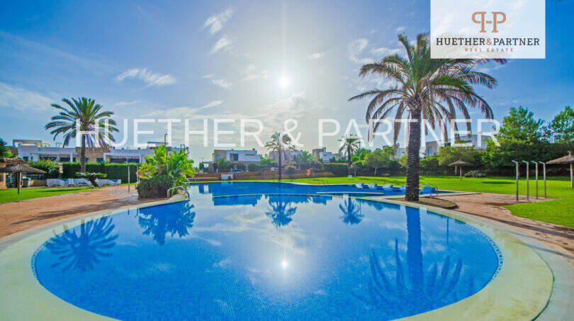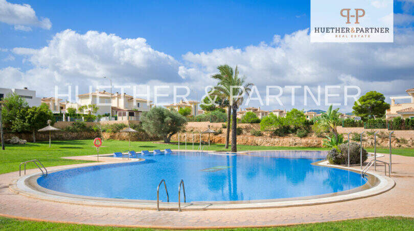 Die gepflegte Gemeinschaftsanlage bietet einen großzügigen Swimmingpool sowie weitläufige Grünflächen, die zum Erholen und Verweilen einladen.