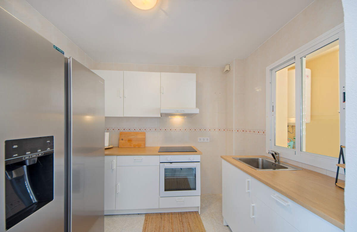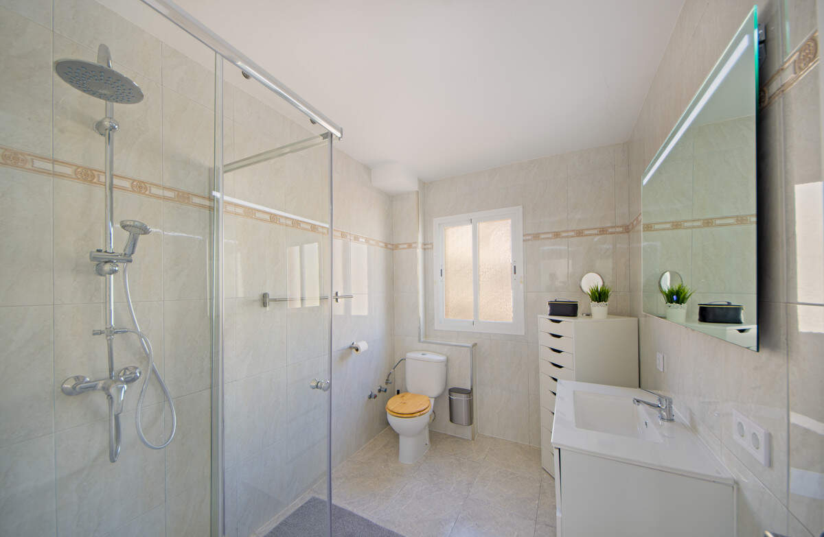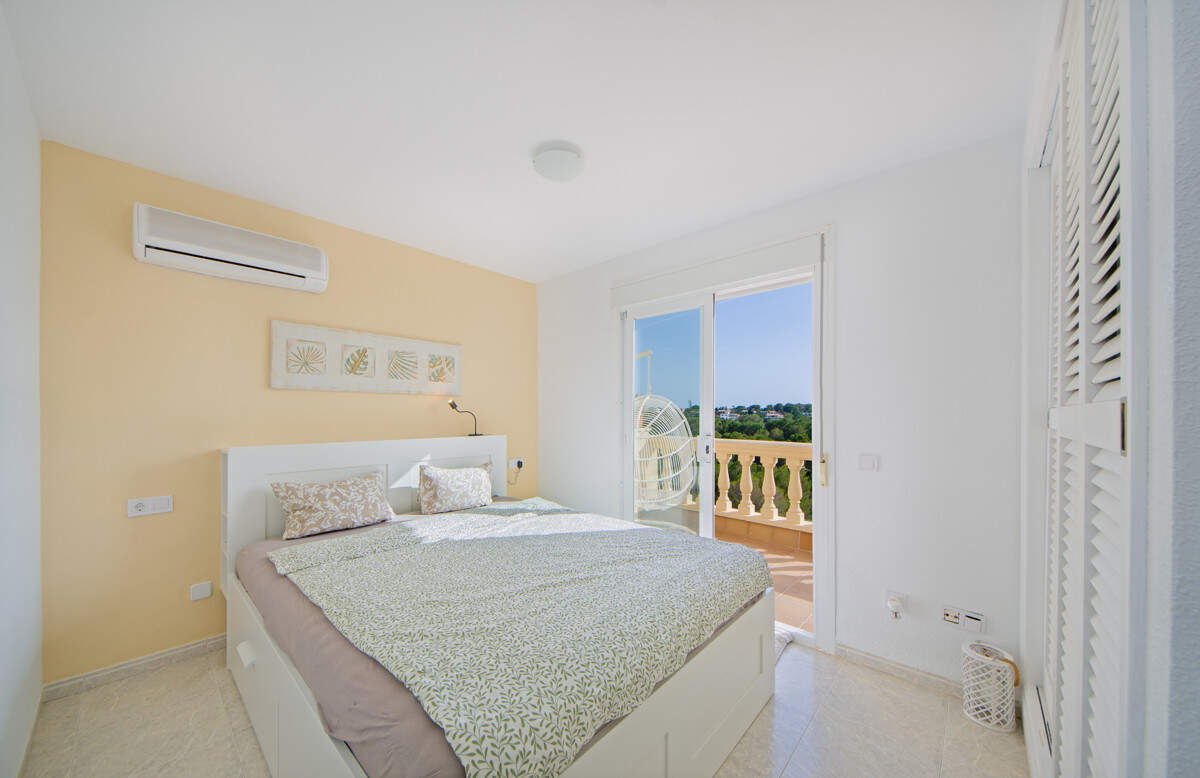 Über eine Treppe gelangen Sie in das Obergeschoss. Hier erwarten Sie zwei komfortable Schlafzimmer mit Einbauschränken sowie ein modernes Badezimmer mit Dusche. Beide Schlafzimmer verfügen über einen eigenen Balkon: Einer mit Blick in die gepflegte Anlage, der andere mit schönem Blick auf das nahegelegene Meer.