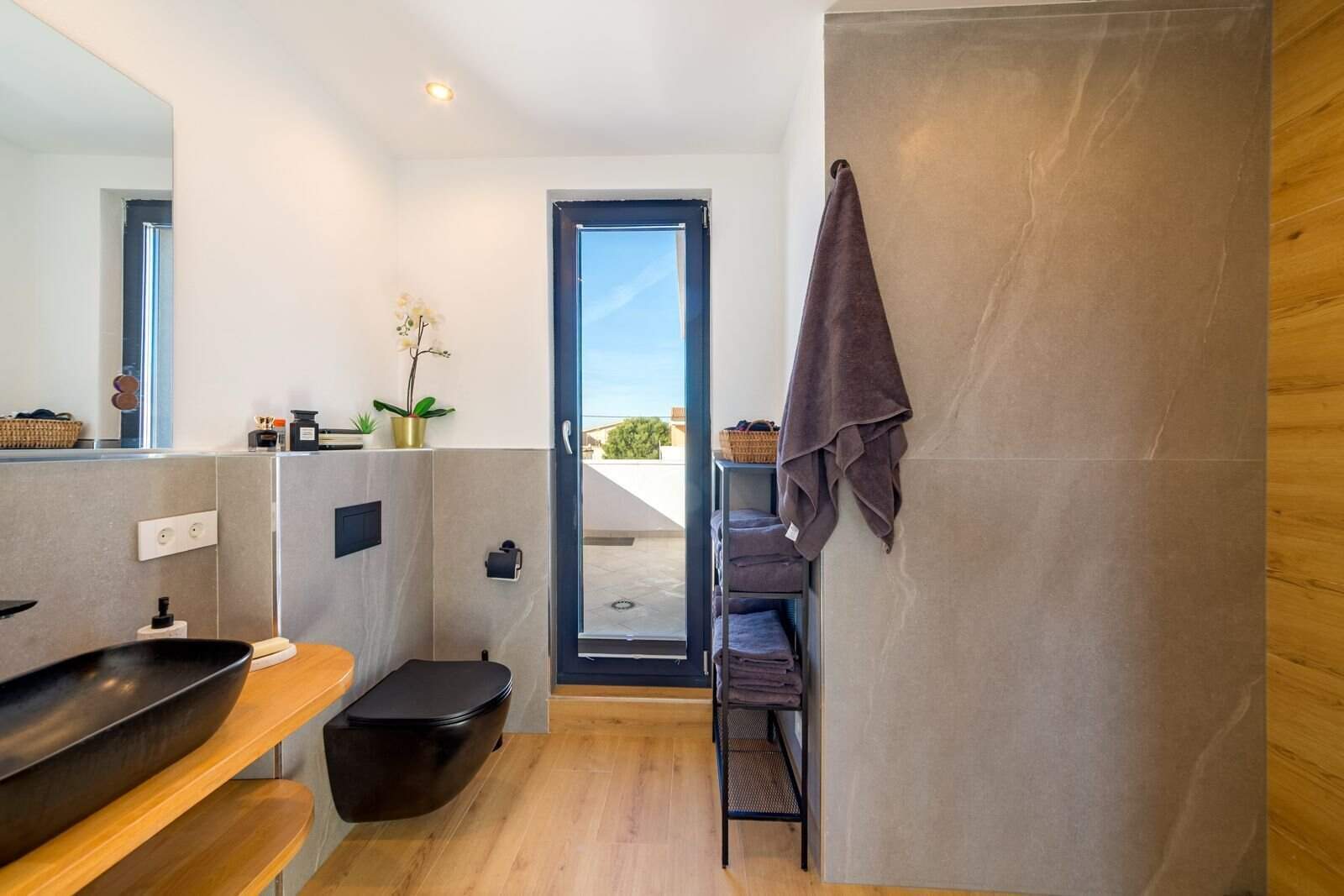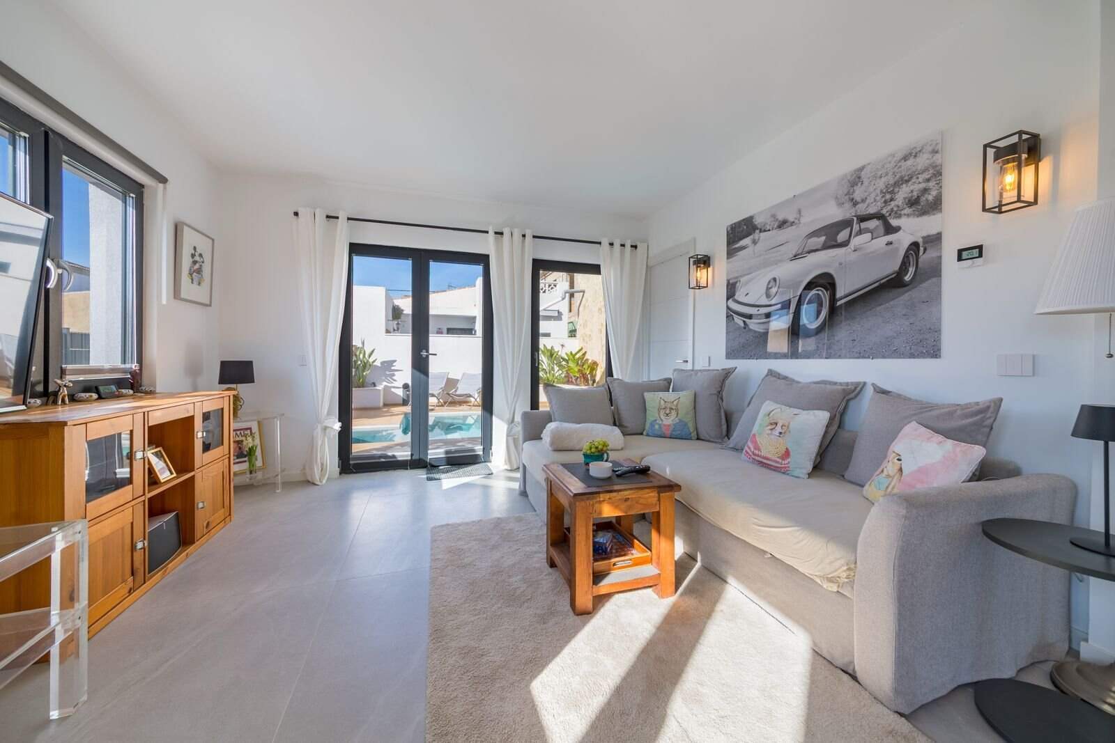 Die offene Wohn- und Essküche bildet das Zentrum des Hauses und verbindet Kochen, Wohnen und geselliges Beisammensein elegant. Zwei Schlafzimmer mit Balkonzugang, drei moderne Bäder sowie ein separates Gästehaus, das als Büro oder Studio genutzt werden kann, bieten flexible Nutzungsmöglichkeiten. Hochwertige Fliesen im Großformat, dreifach verglaste Fenster, Fußbodenheizung in allen Räumen und Internetanschlüsse in jedem Zimmer unterstreichen den hohen Standard. Die großzügige Dachterrasse mit Pergola eröffnet einen Panoramablick auf das Meer, den Naturstrand Es Trenc und die Insel Cabrera. Der private Poolbereich lädt zur Entspannung ein und ergänzt die mediterrane Atmosphäre des Hauses.