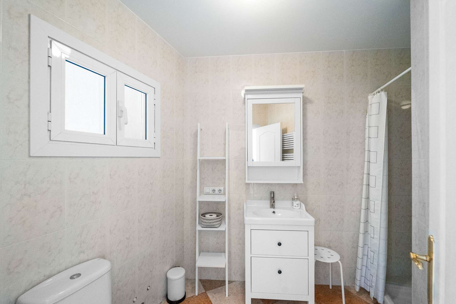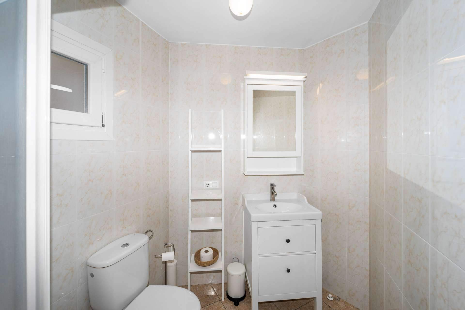 Im Erdgeschoss gibt es ein geräumiges Wohnzimmer, eine Küche offen zum Esszimmer, ein Badezimmer und eine Garage für ein Auto. Vom Esszimmer aus hat man Zugang zu einem Innenhof von ca. 30m². Die Küche ist voll ausgestattet mit hochwertigen Geräten.