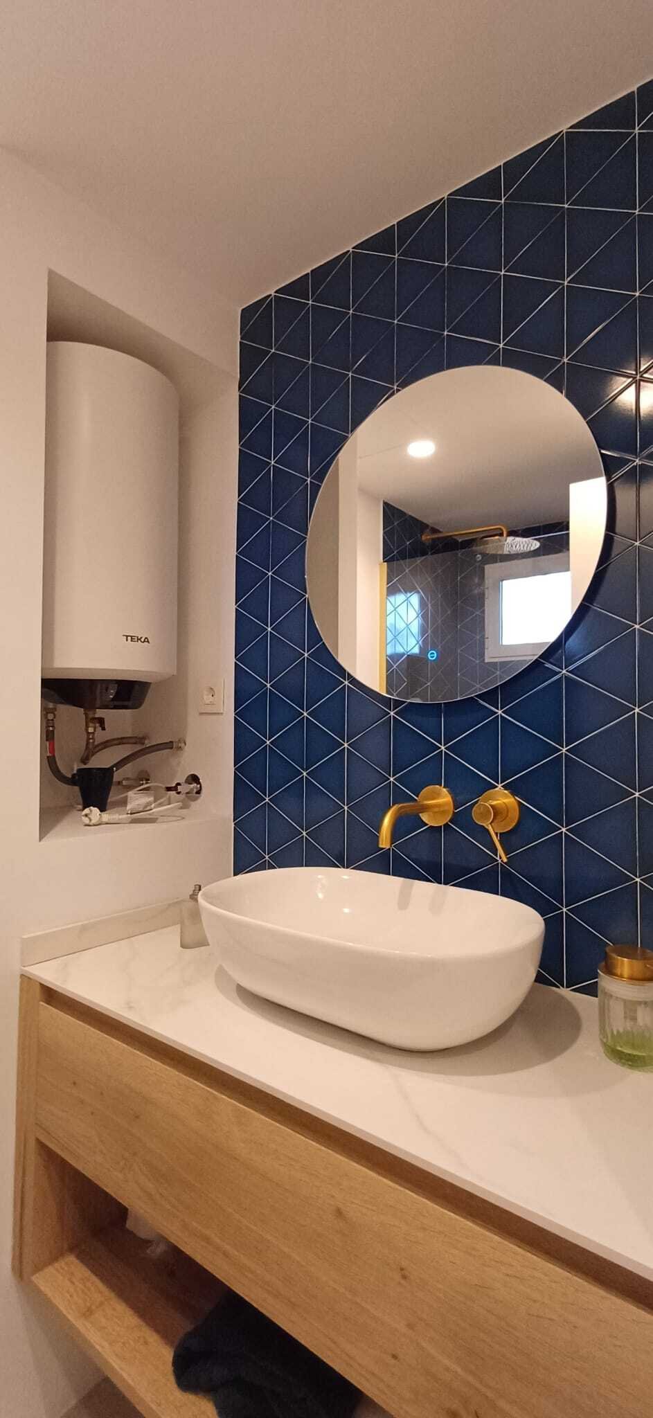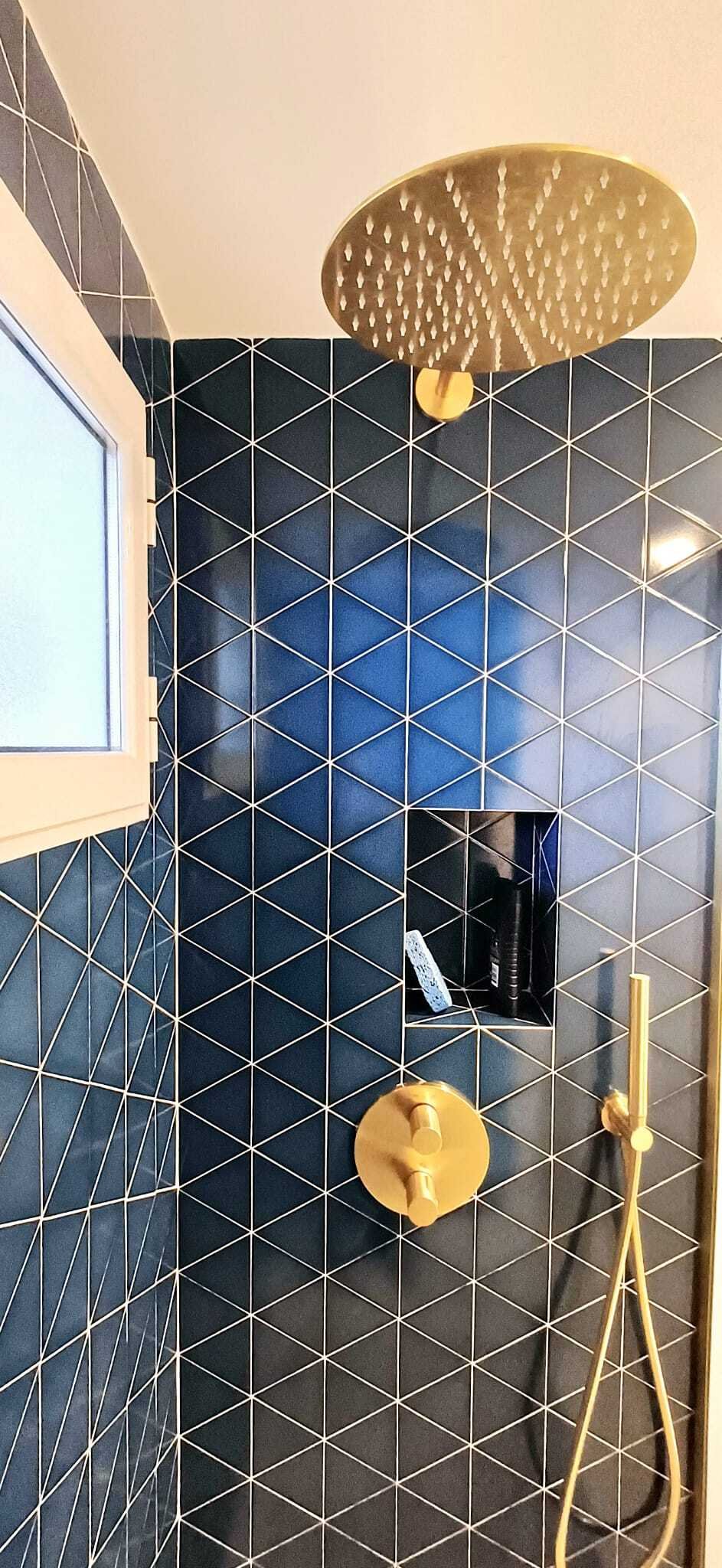 Geschirrspüler - Modernes Badezimmer mit stilvollen blauen Fliesen und verchromten Armaturen