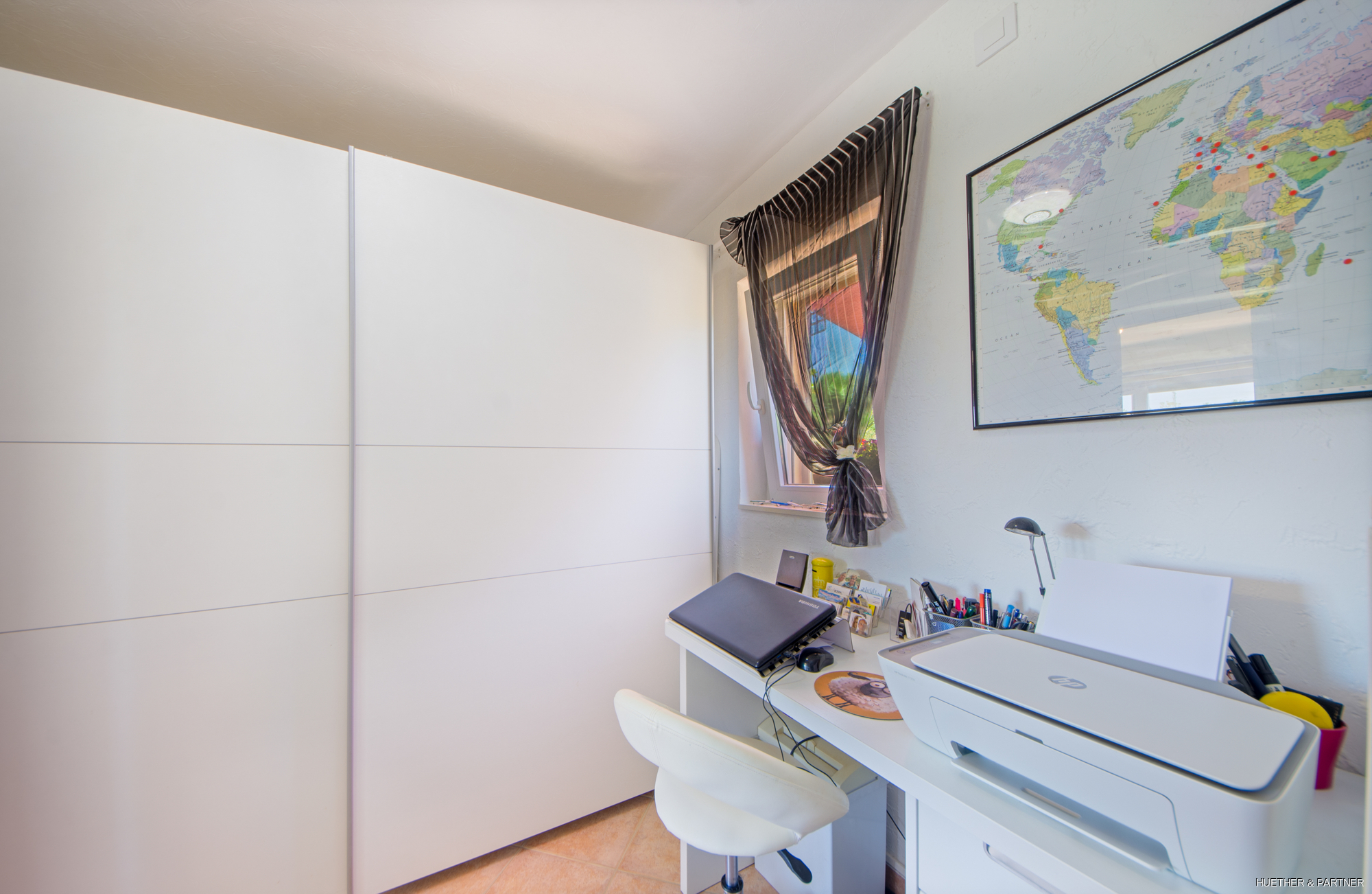Im ersten Obergeschoss befinden sich Wohn-Esszimmer, moderne Küche, Doppelschlafzimmer, Duschbad sowie ein weiteres Schlafzimmer, das derzeit als Büro genutzt wird. Vom Wohnzimmer aus gelangt man auf eine überdachte Terrasse von etwa 16m², die einen schönen Blick ins Tal eröffnet. Eine weitere überdachte Terrasse von rund 7, 5m² liegt direkt am Schlafzimmer.