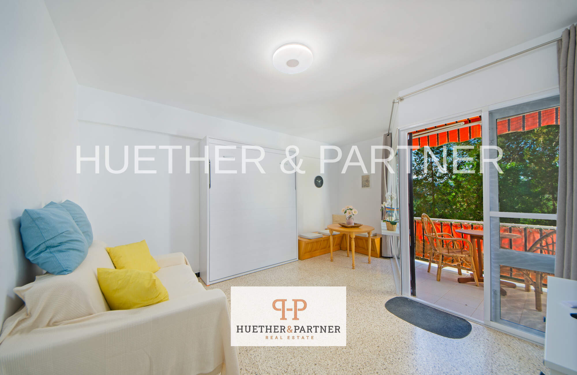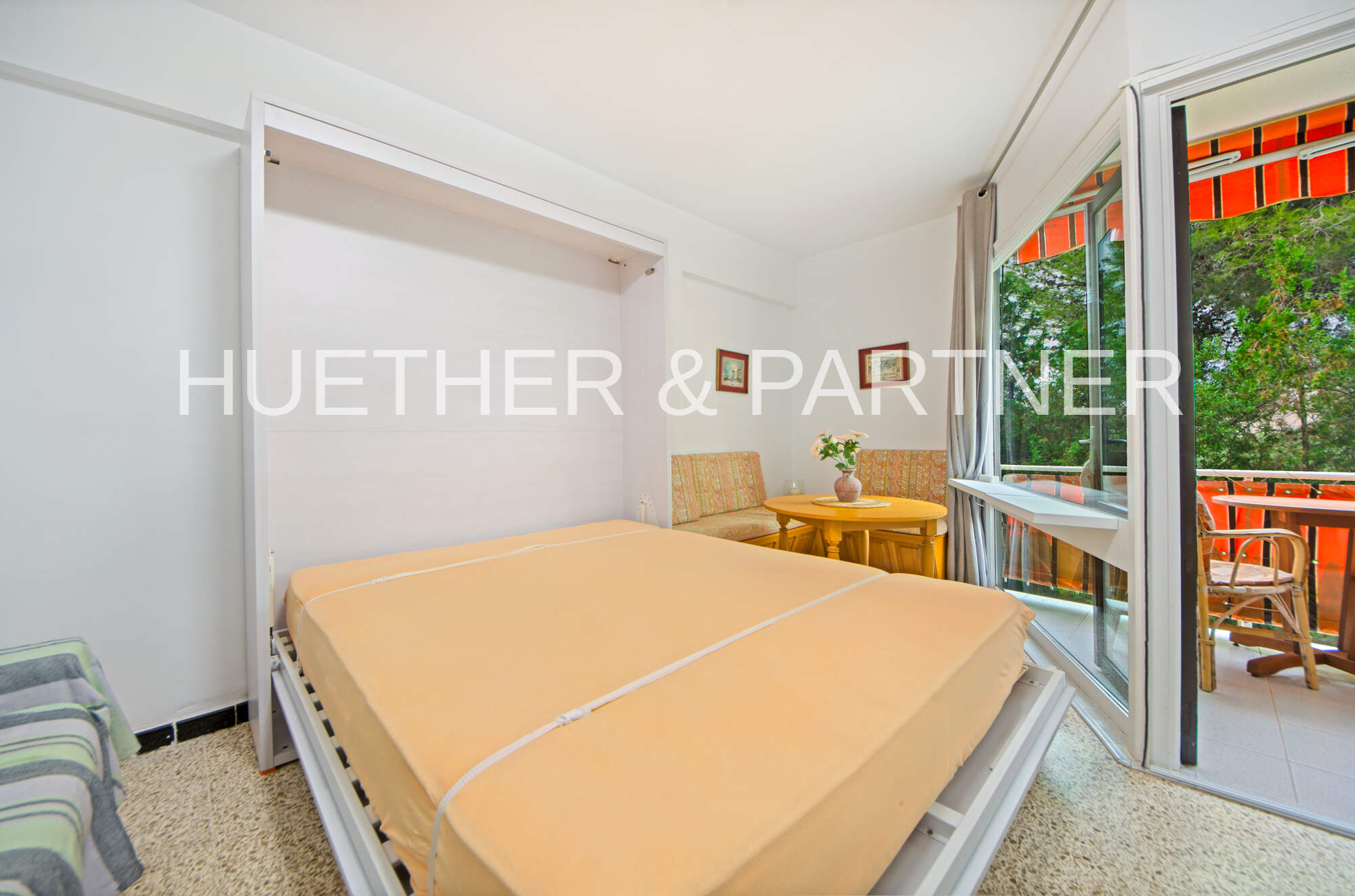- Helles Wohn-/Schlafzimmer mit Klappbett, Couch, Schrank und Esstisch