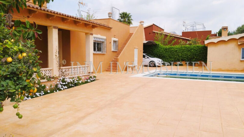 Das Anwesen, auf einer Ebene und mit einer ungefähren Wohnfläche von 236m², verfügt über fünf Schlafzimmer und zwei Bäder. Es verfügt über eine Küche mit Backofen, Mikrowelle und Cerankochfeld sowie ein geräumiges Wohn-Esszimmer mit Kamin, der für eine warme und gemütliche Atmosphäre sorgt. Im Außenbereich gibt es zwei überdachte Veranden, eine an der Vorderseite und eine an der Rückseite des Hauses, die ideale Plätze bieten, um die frische Luft zu genießen. Der Garten, der perfekt gepflegt und mit einer Sprinkleranlage ausgestattet ist, umgibt das Anwesen, zu dem auch eine 35m² große Garage gehört.